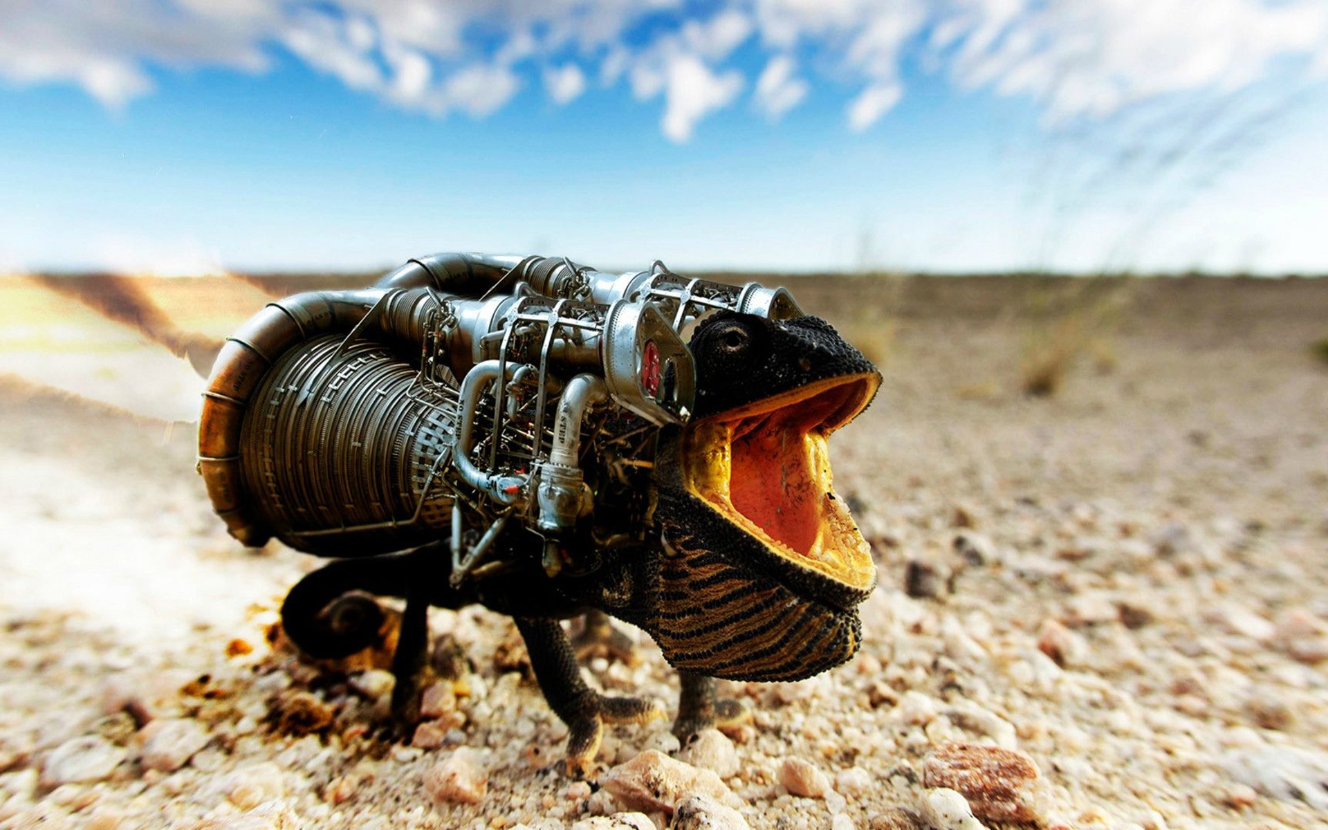 A fantastic fighter with a weapon on his back, a chameleon with his mouth wide open