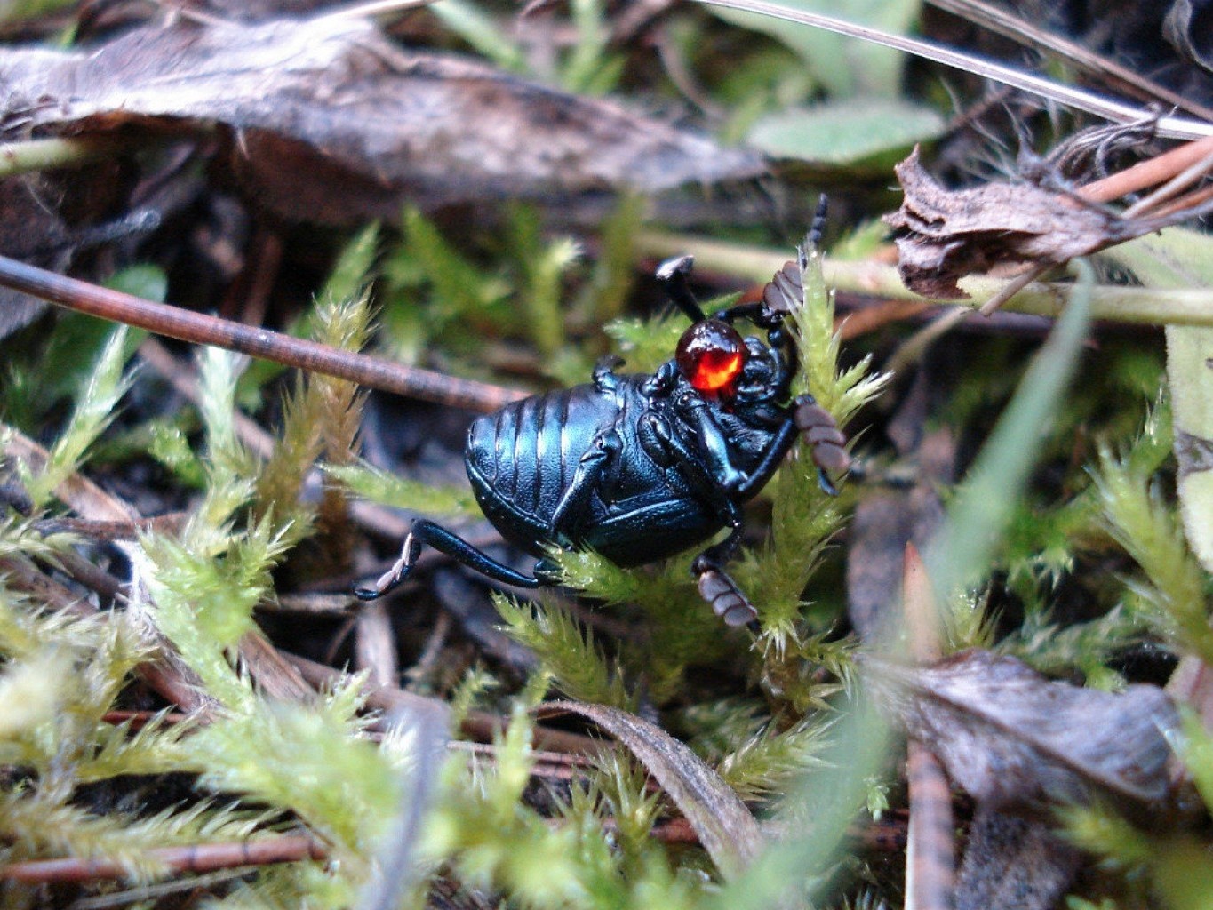 A black insect with bright orange eyes