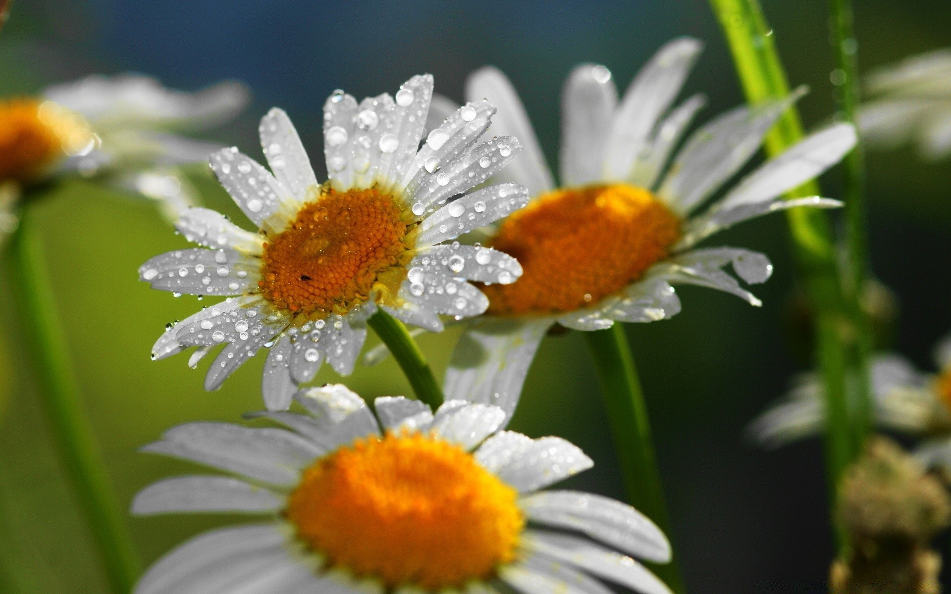 Three daisies with drops on the petals