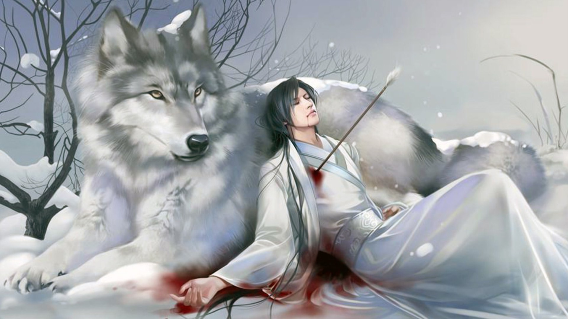 The wounded man lies at the snow wolf