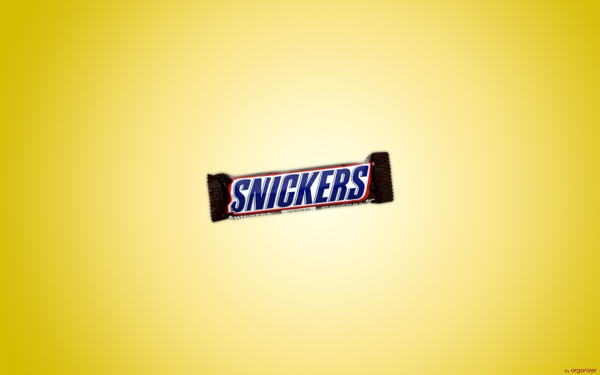 A snickers bar on a yellow background