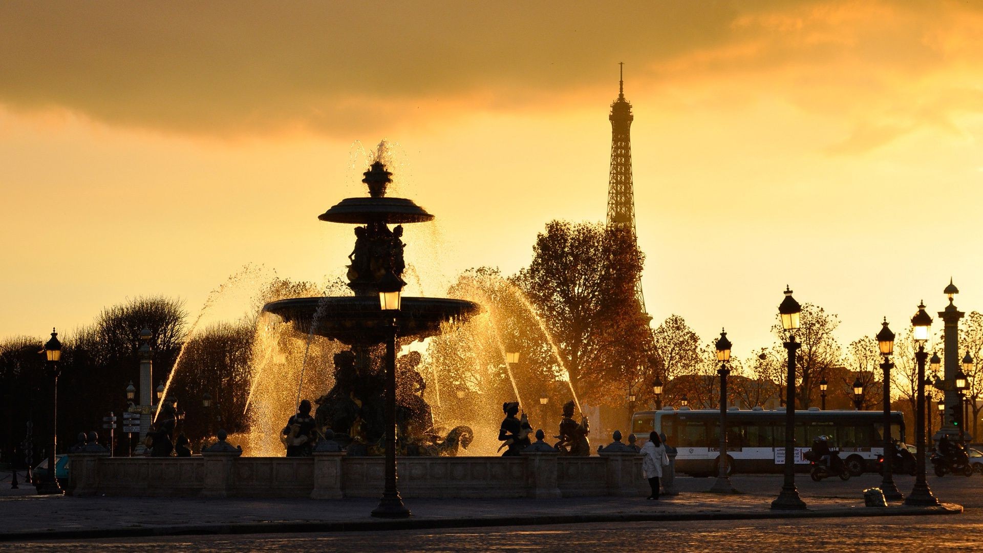 The famous Louvre Museum in Paris on the background of a pink sunset without crowds of tourists