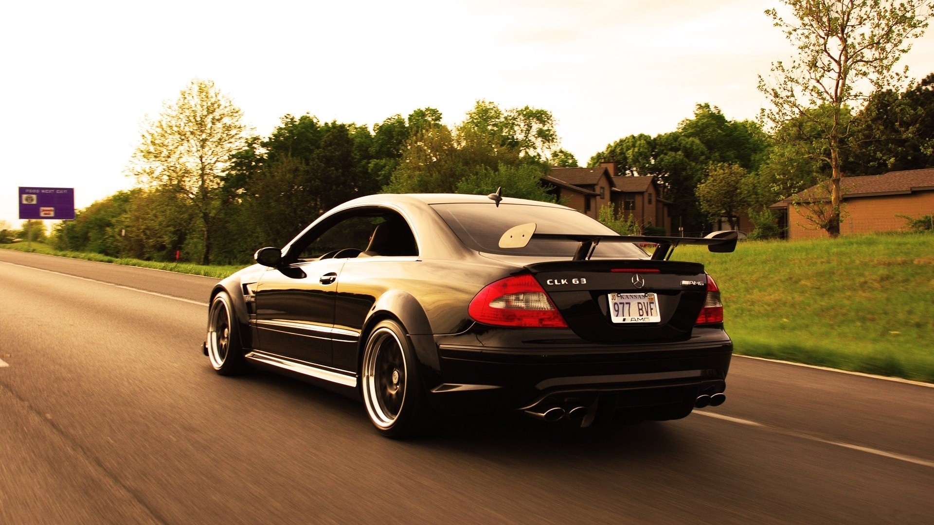 Mersedes CLK 63 with rear anti-wing rushes on a flat asphalt