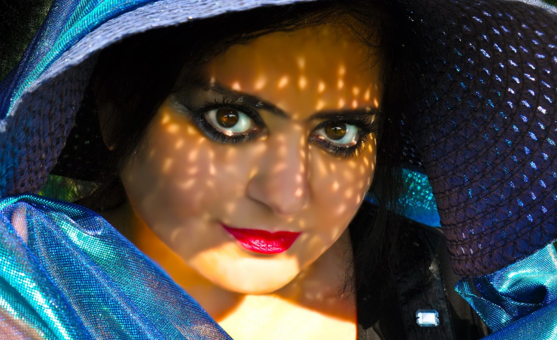 A dark-haired girl sitting at a desk, next to a briefcase with a peeking hand