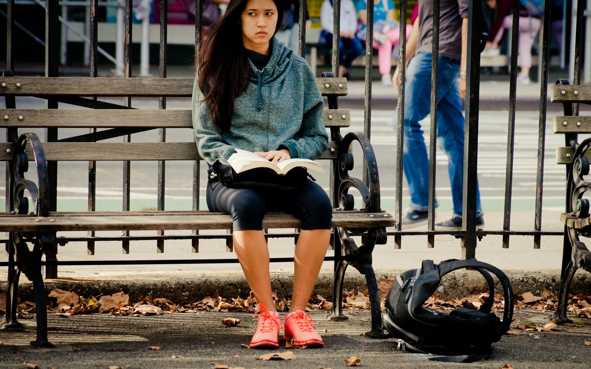 The girl is sitting on a bench near the fence