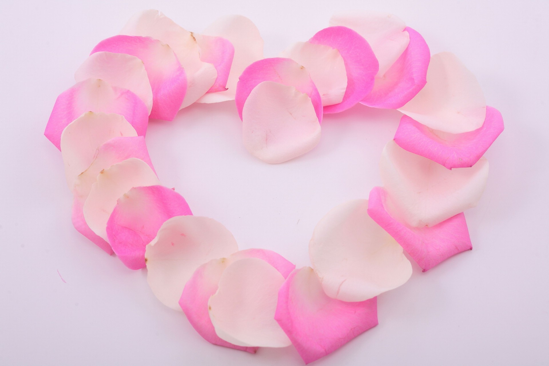 Pink and white petals laid out in the shape of a heart