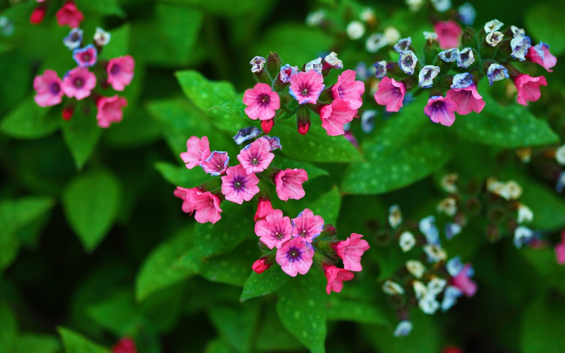 Pink flowers on a background of juicy green leavesPink flowers on a background of juicy green leaves