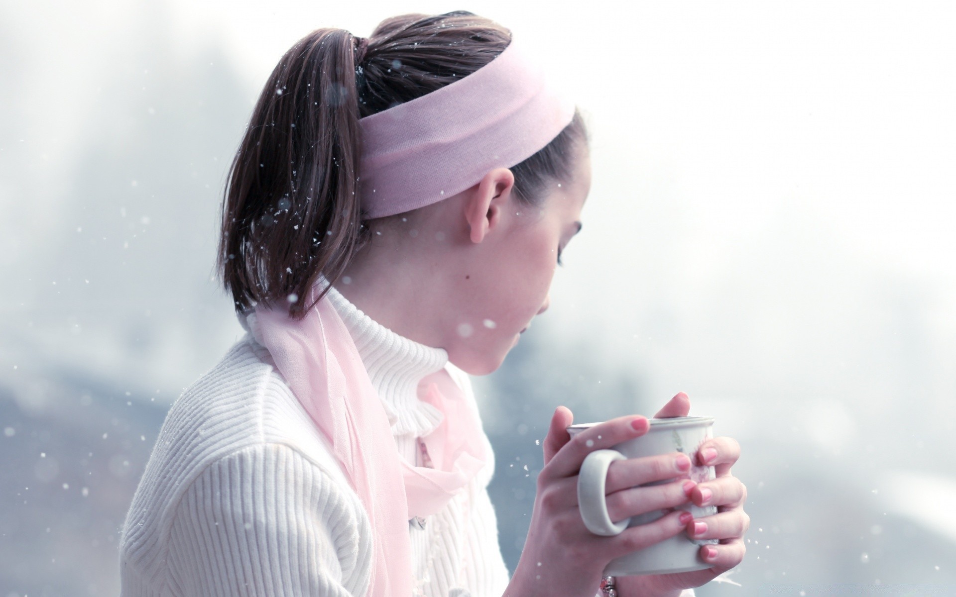 A girl with a pink headband holds a mug in her hands against a background of fine snowA girl with a pink headband holds a mug in her hands against a background of fine snow