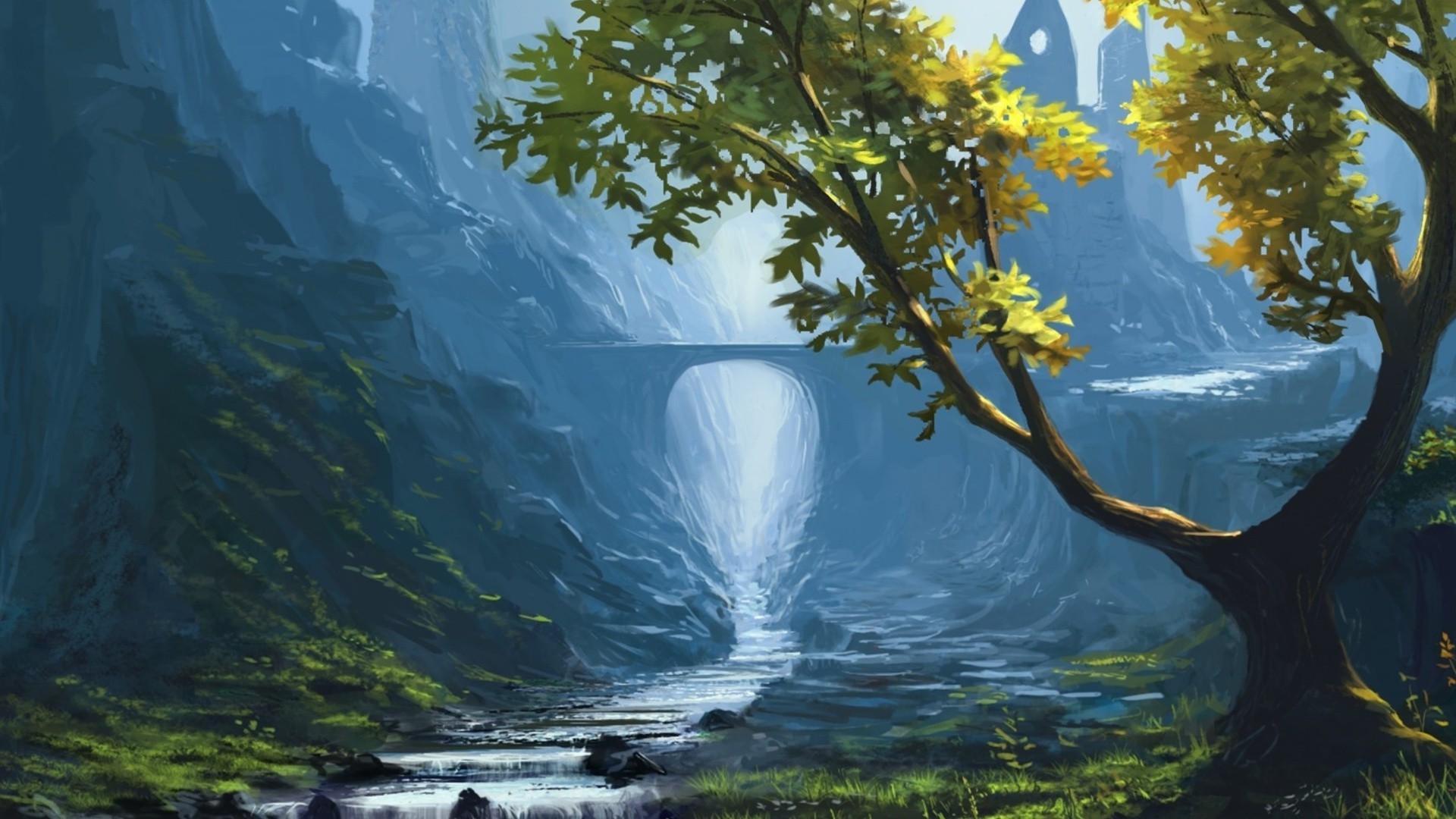 The setting sun peeking out from behind a tree against the background of waterThe setting sun peeking out from behind a tree against the background of water