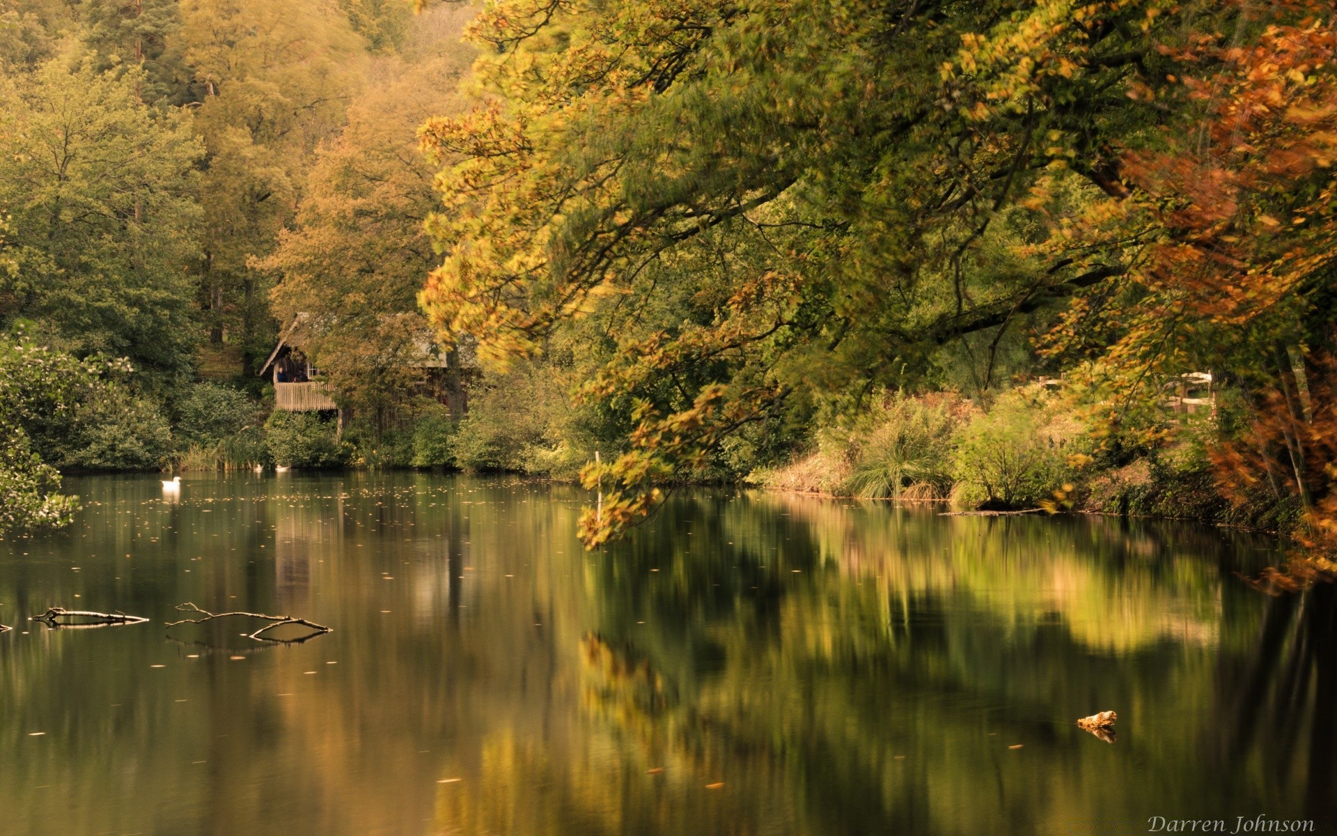 Trees in autumn attire, reflected in the surface of the lake in clear and windless weather