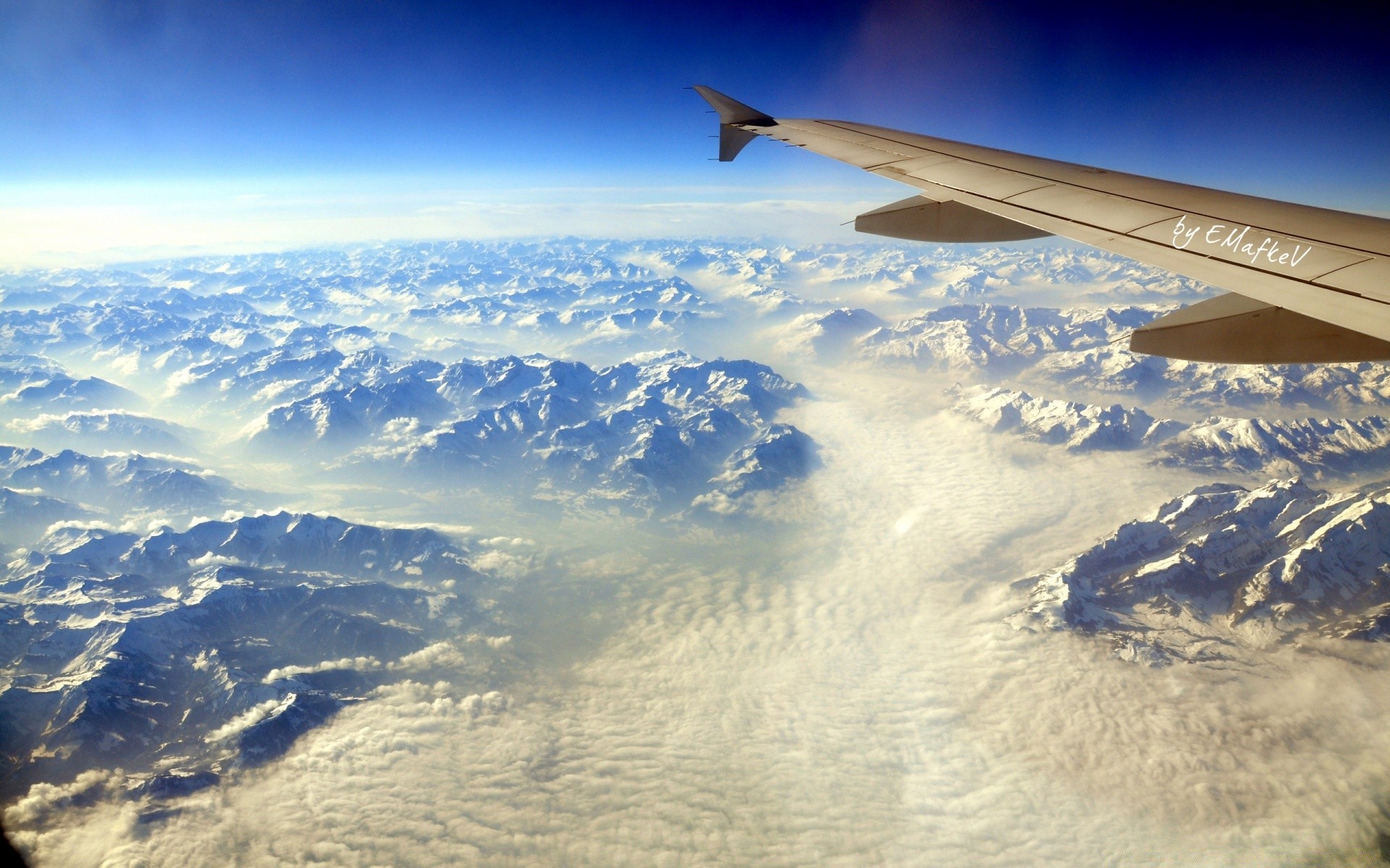 Under the wing of the plane, the mountains are turning white (apparently, the Alps), because he directed the way to Europe