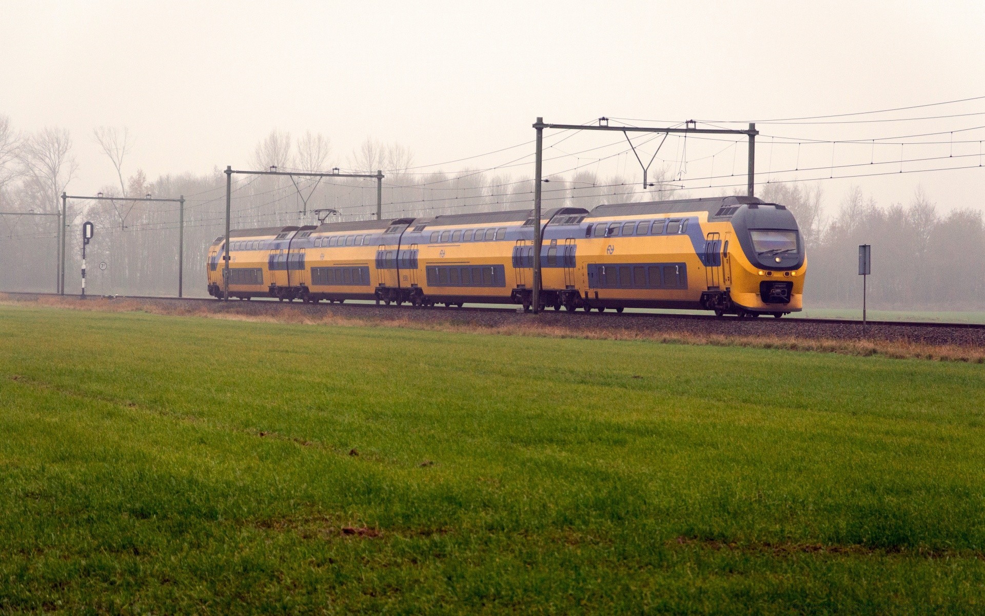 ELECTRIC TRAIN IN FOG ON THE BACKGROUND OF A LAWN IN FOG