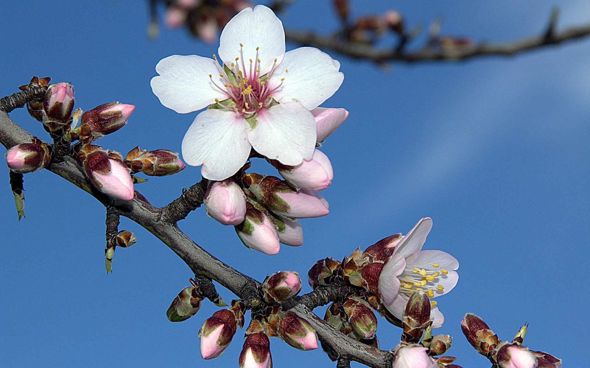 White flowers with five petals three flowers in the foreground blurred background in the background blue sky with clouds