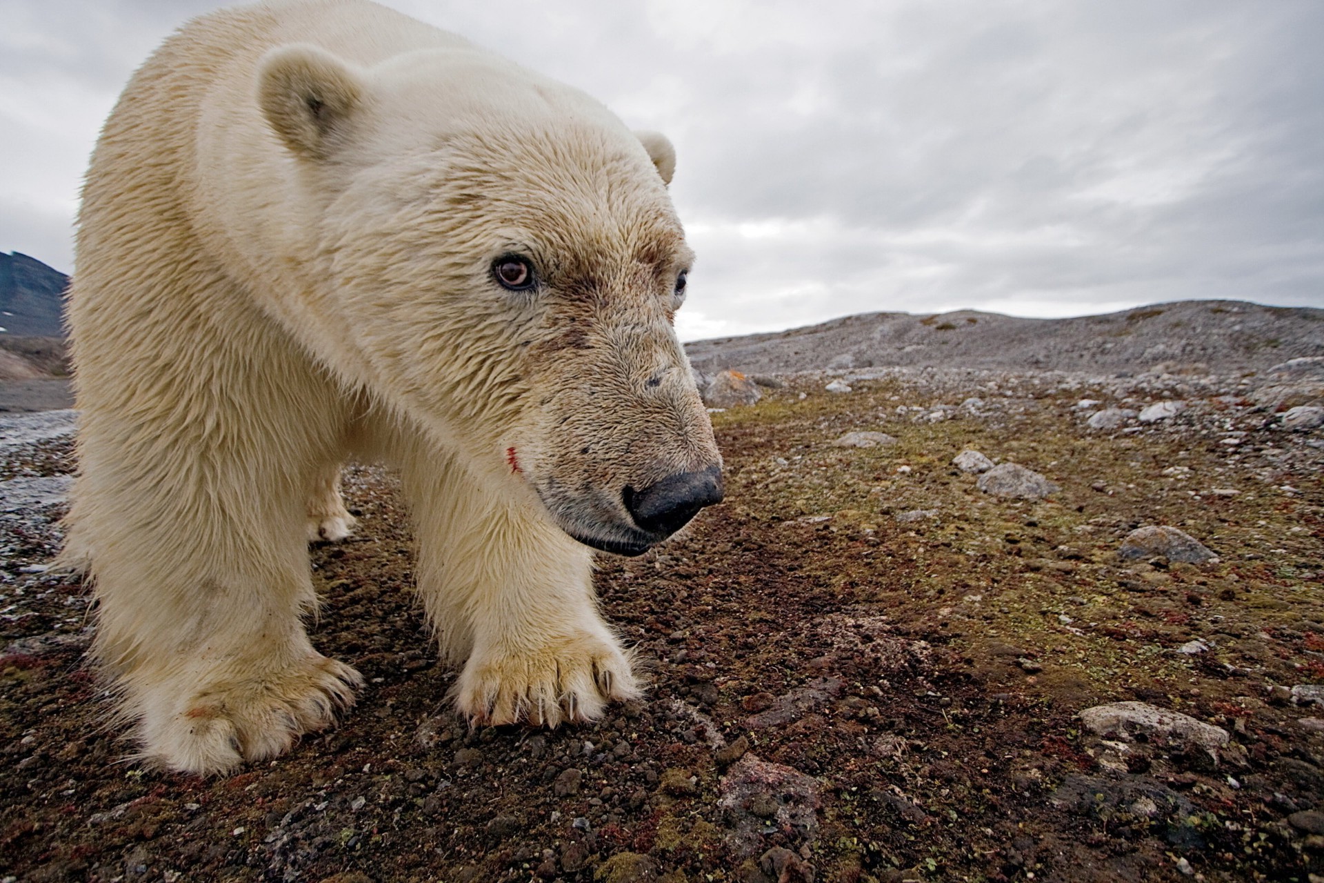 A polar bear with a bloody muzzle