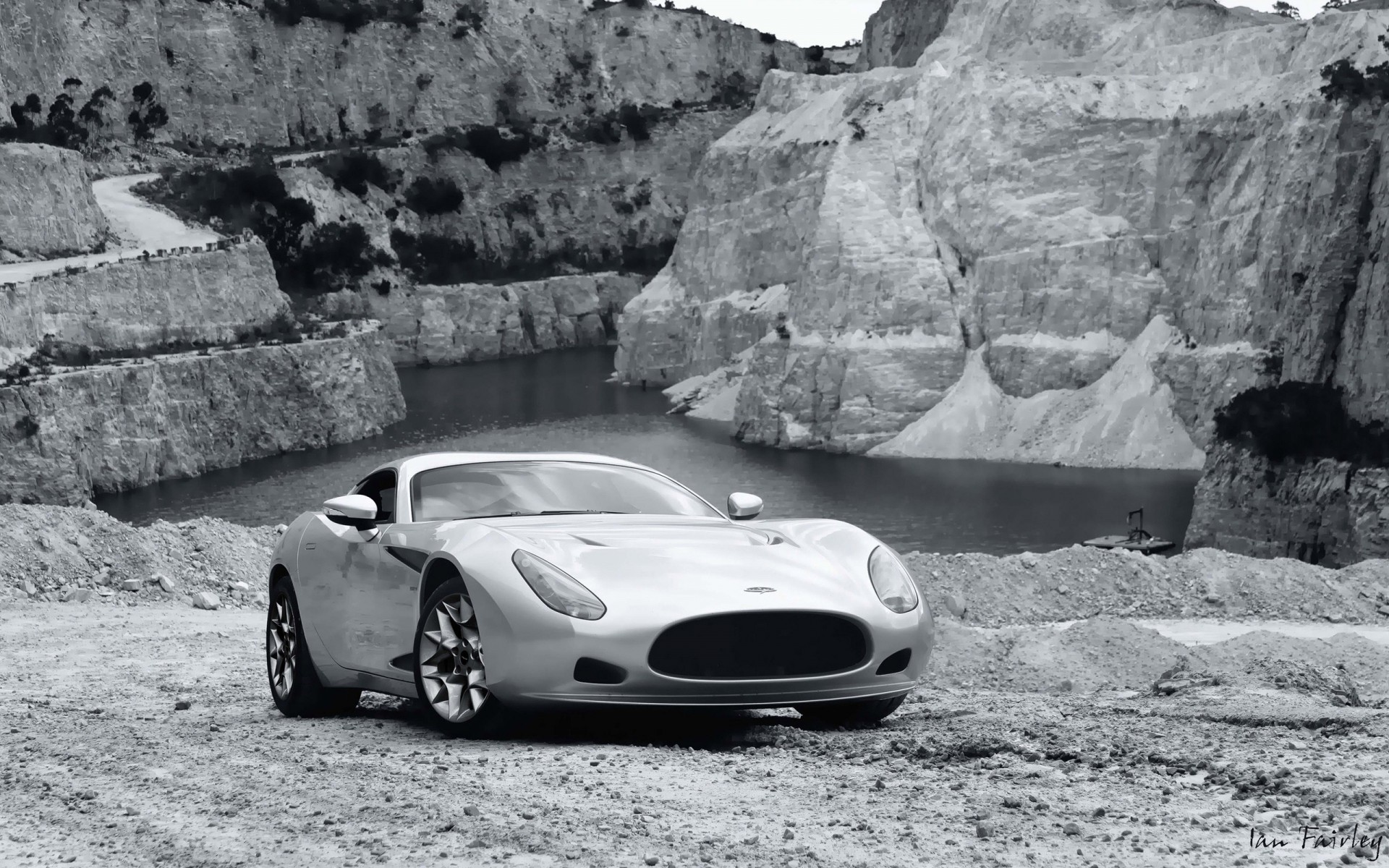 Grey car in grey mountains by grey lake