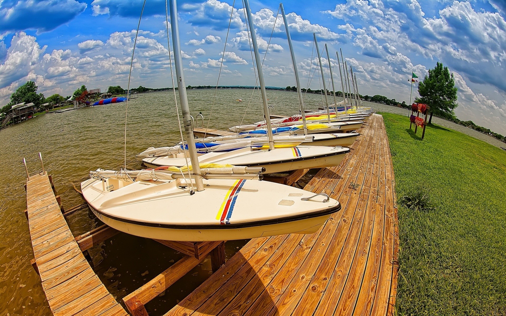 A lake among green hills. Blue sky and white clouds