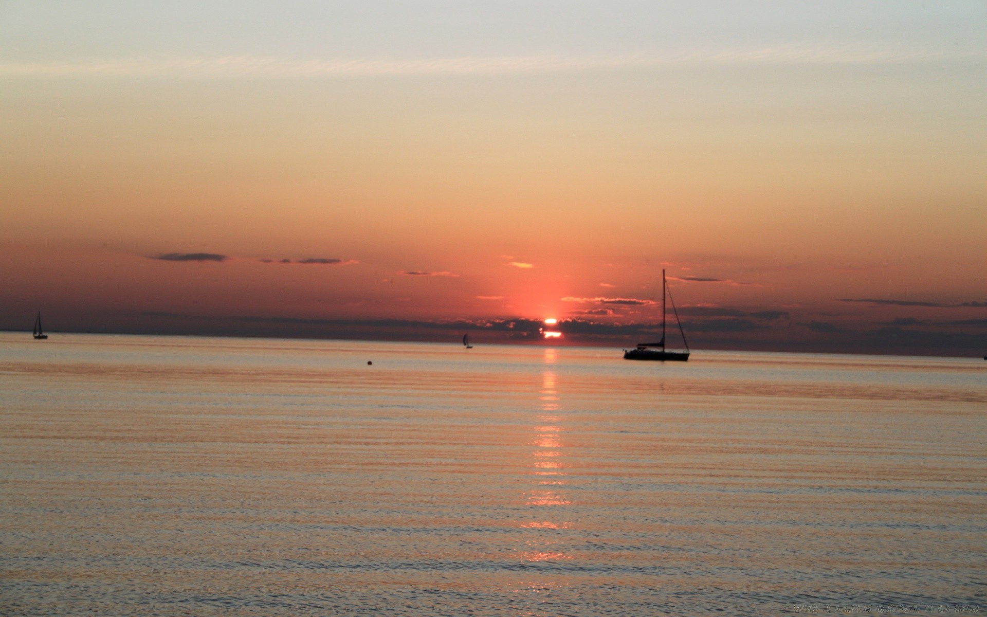 Boats on the sea surface in the light of the setting sun
