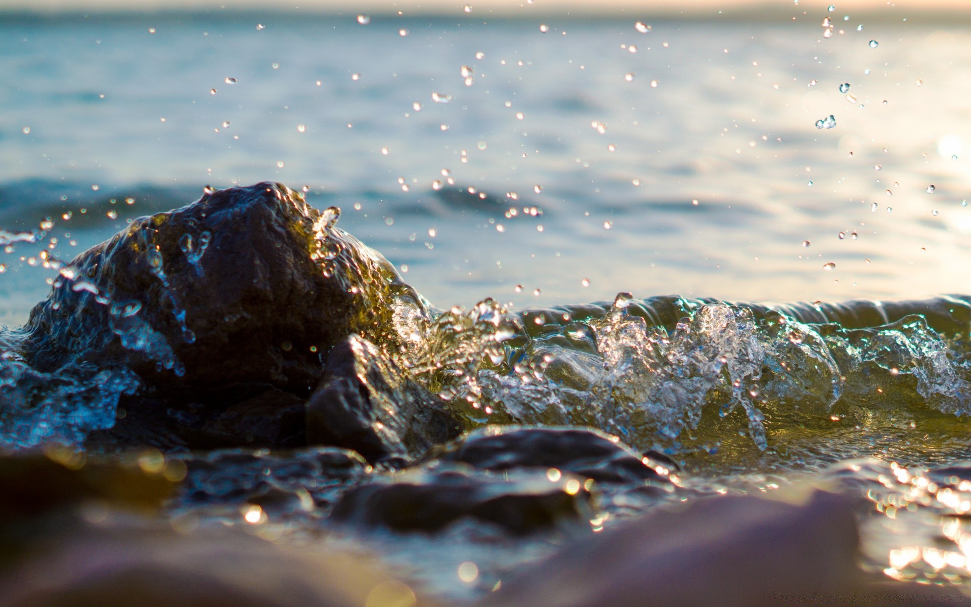 The sea in a calm state beats against the rocks on the shore