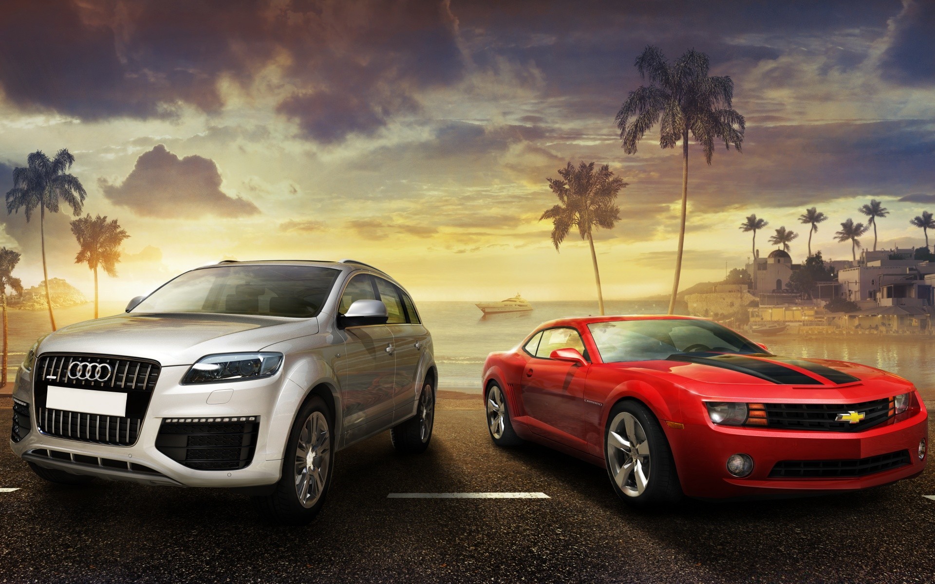 The car is standing on the beach with palm trees