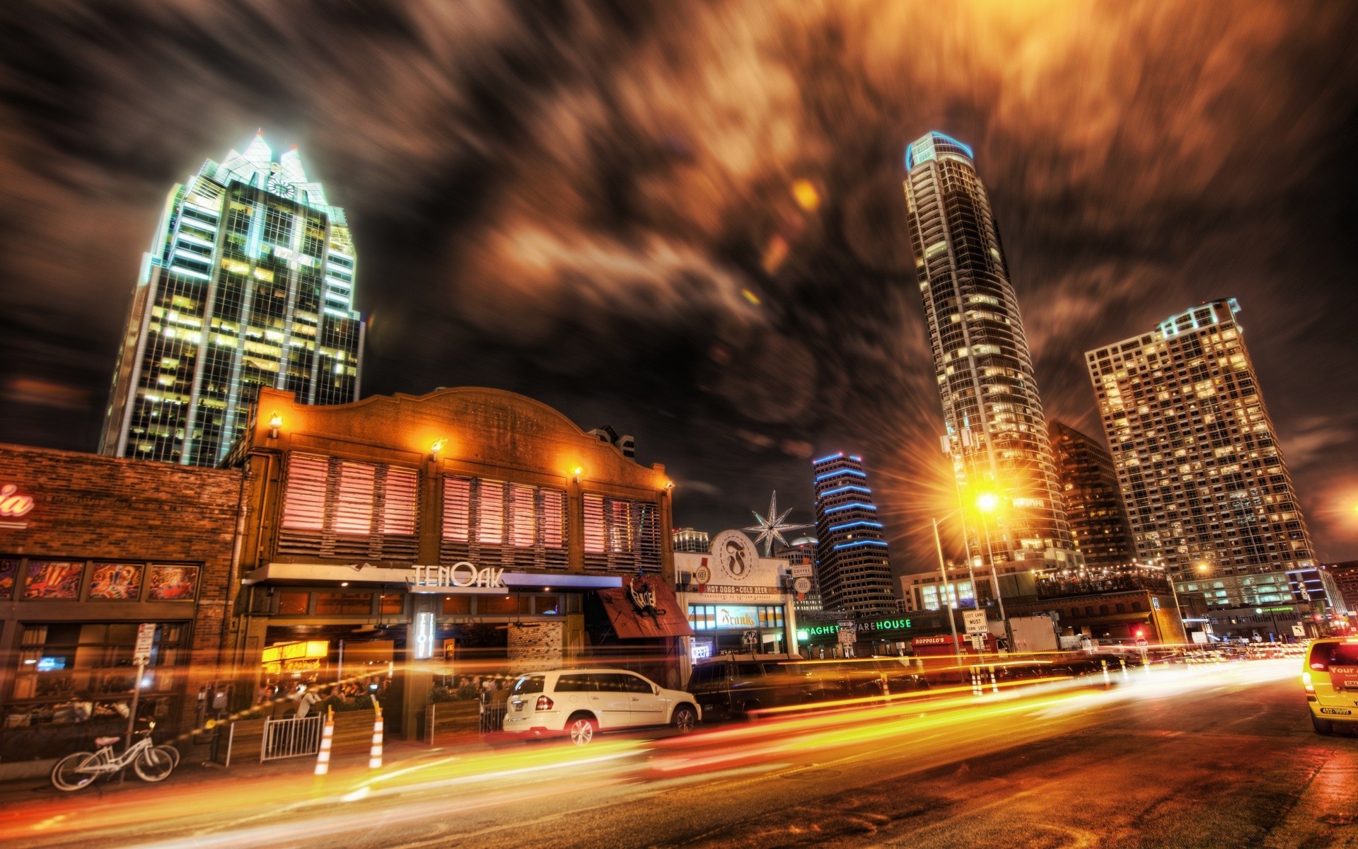 In the center is the night sky in fog bordered by skyscrapers in lights