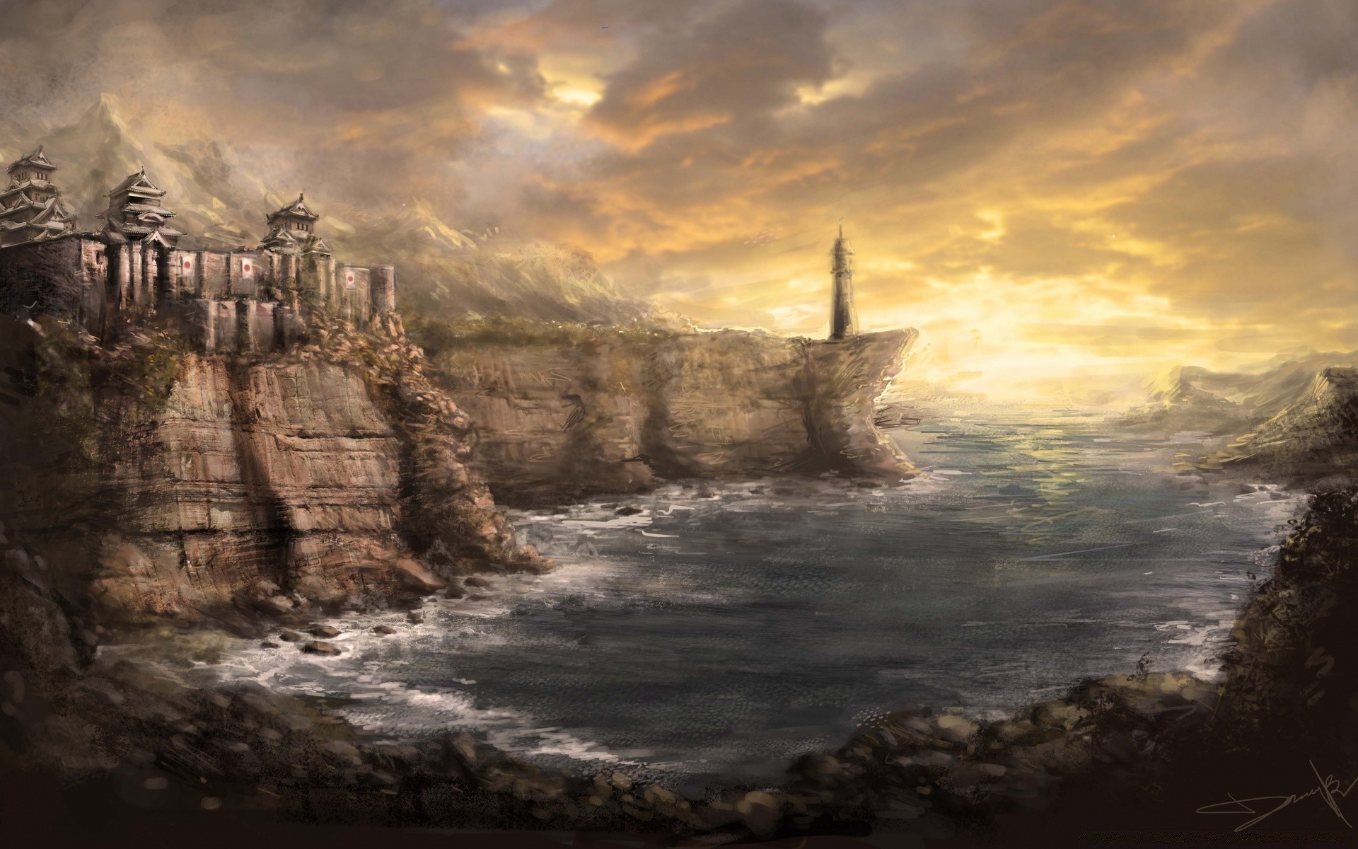 Lighthouse on a steep rocky shore under the night sky in the clouds ah