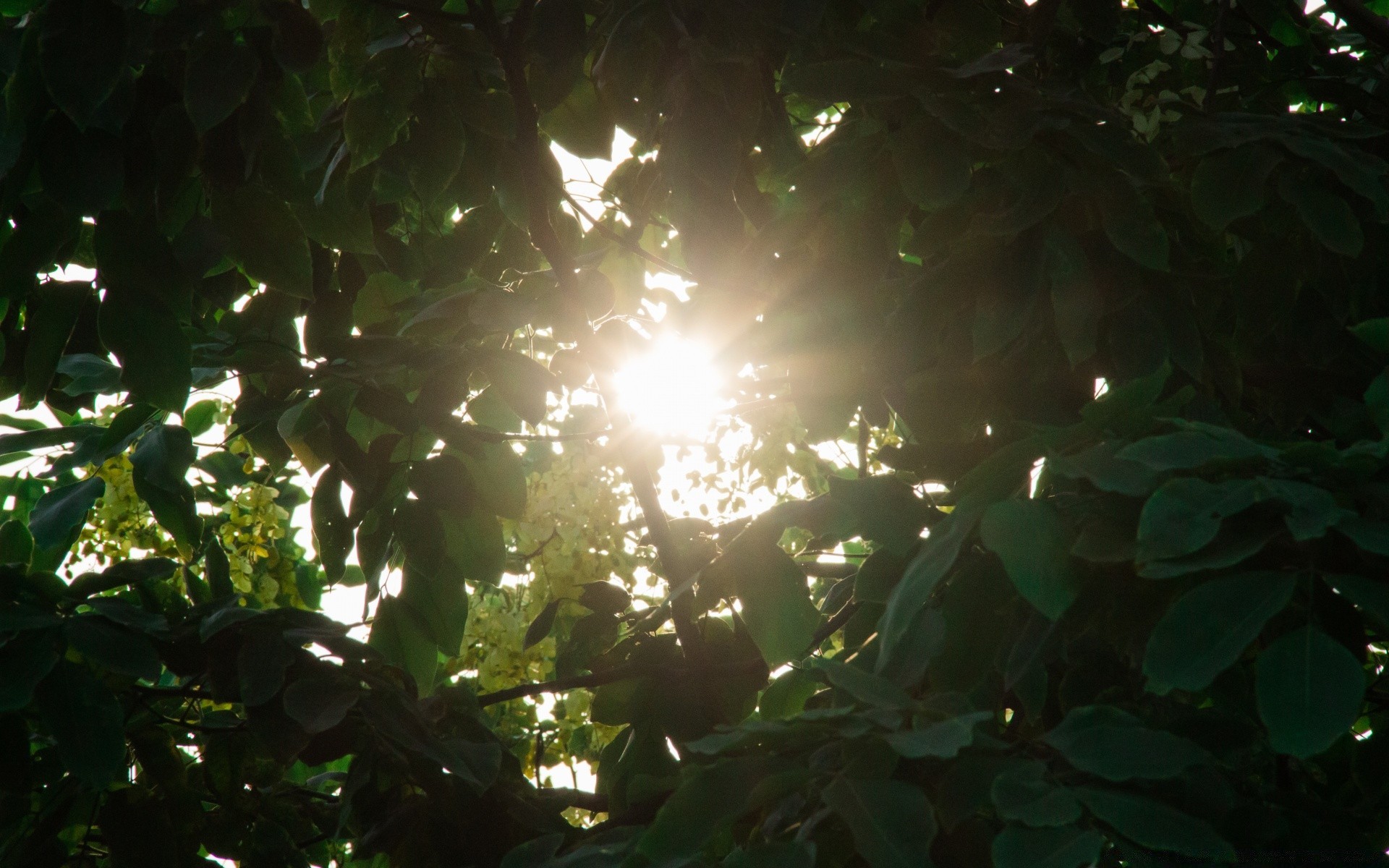 The sun's rays through the leaves of the tree