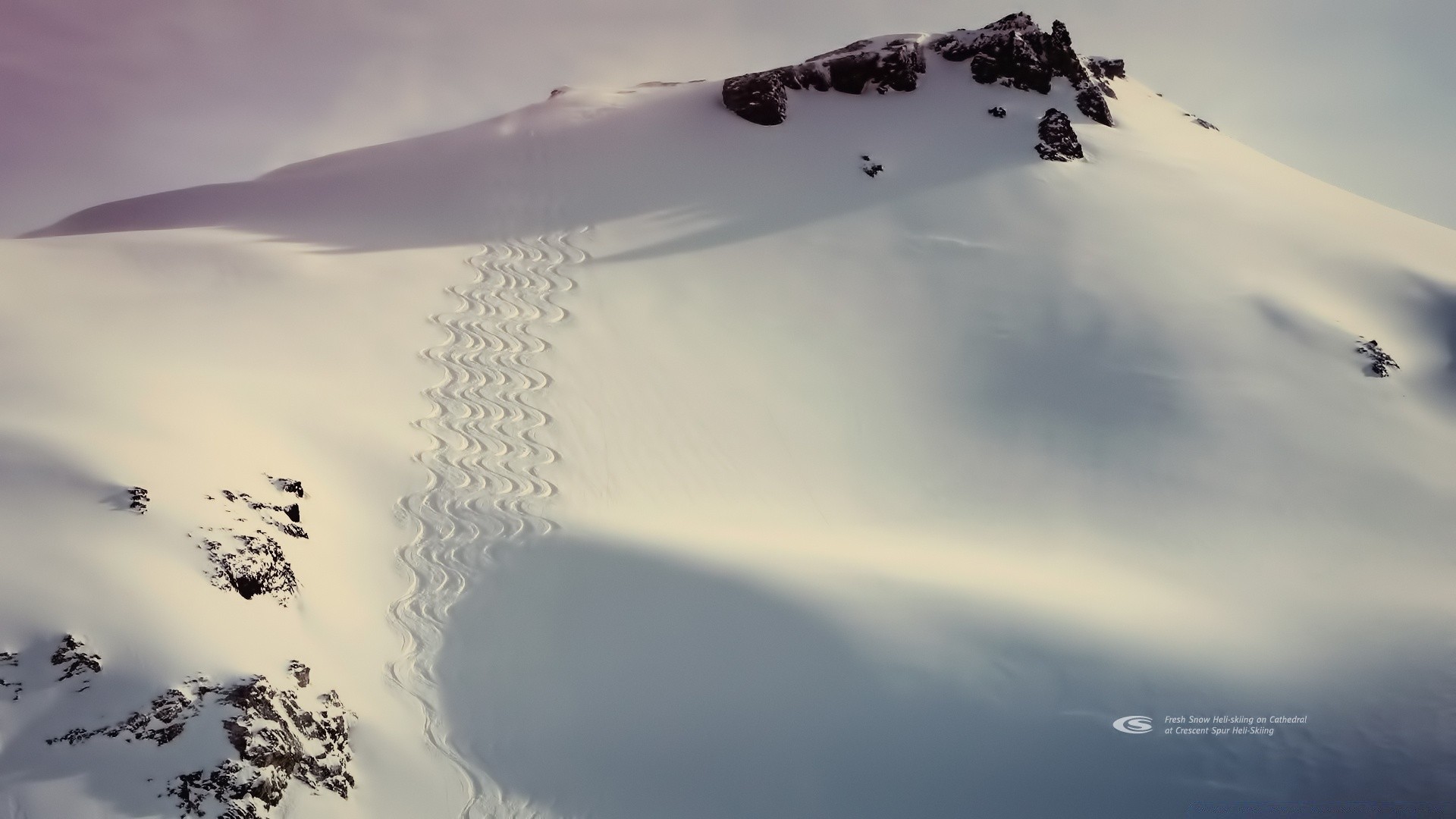 Snowy mountain slope in the rays of the sun with curly footprints in the snow
