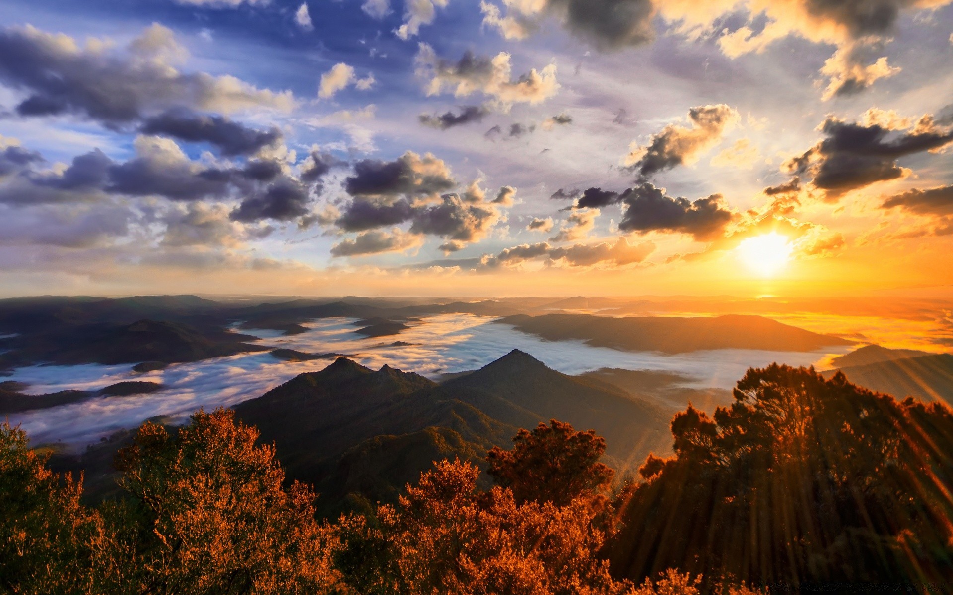 Trees and mountains in the rays of the sun at dawnTrees and mountains in the rays of the sun at dawn