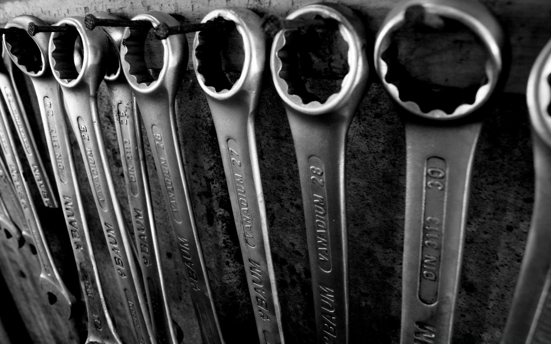 A set of wrenches is hanging on the wall