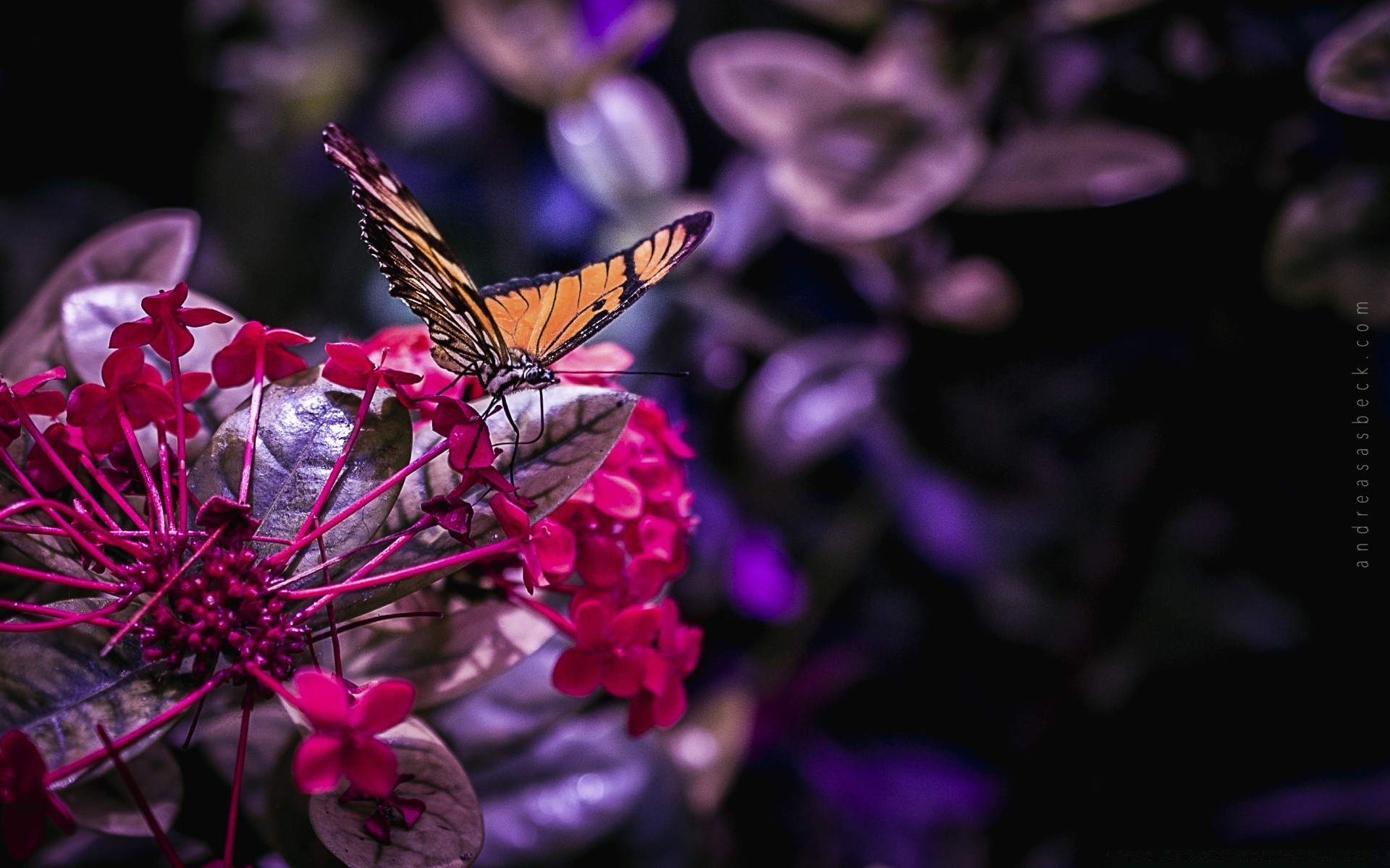 A butterfly on a flower. Red flowers. Dark background