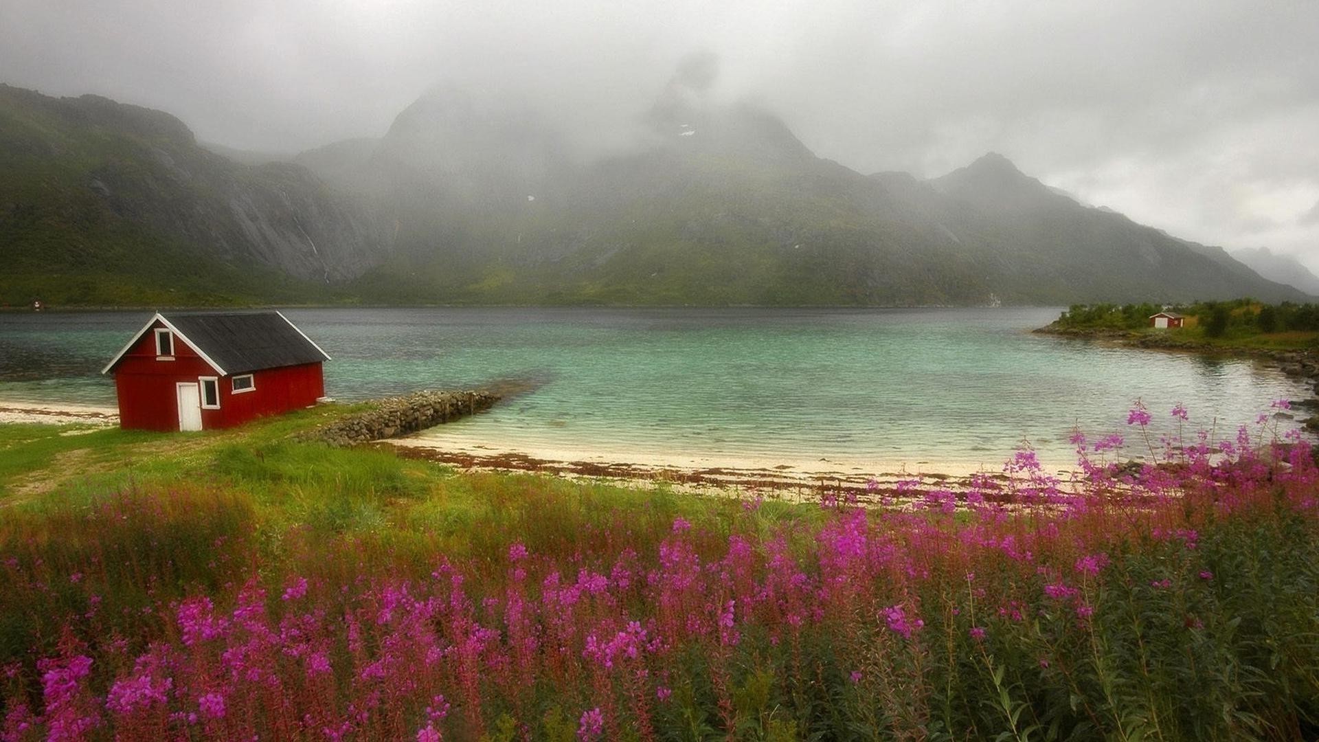 On both banks of the blue river there are churches and green trees against the blue skyOn both banks of the blue river there are churches and green trees against the blue sky