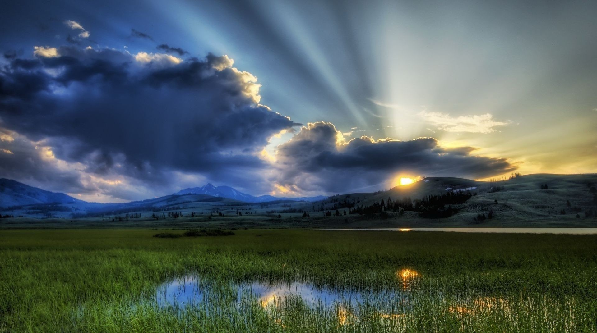 Sunset in a valley with green grass