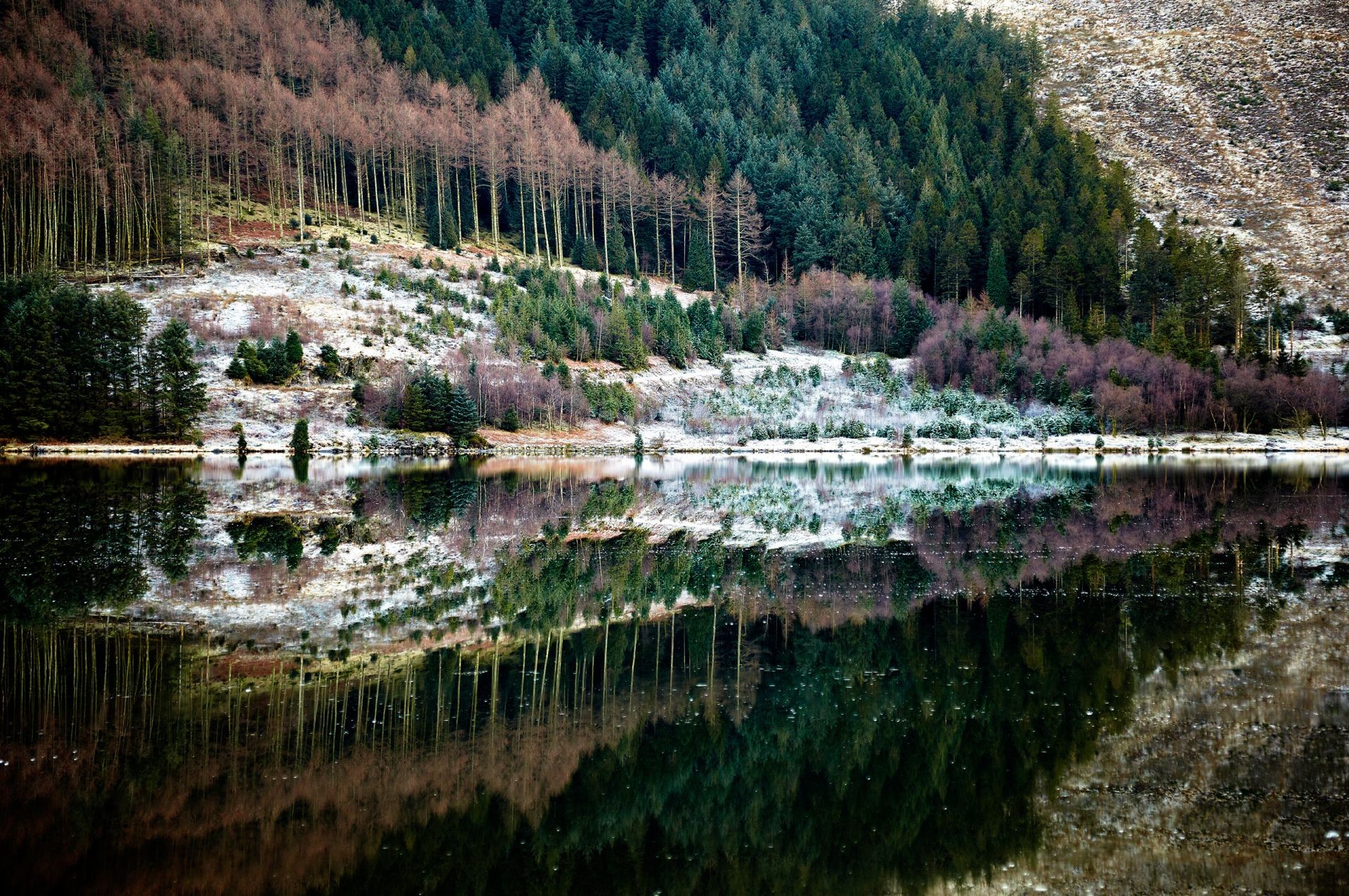 Forest reflection in clear water