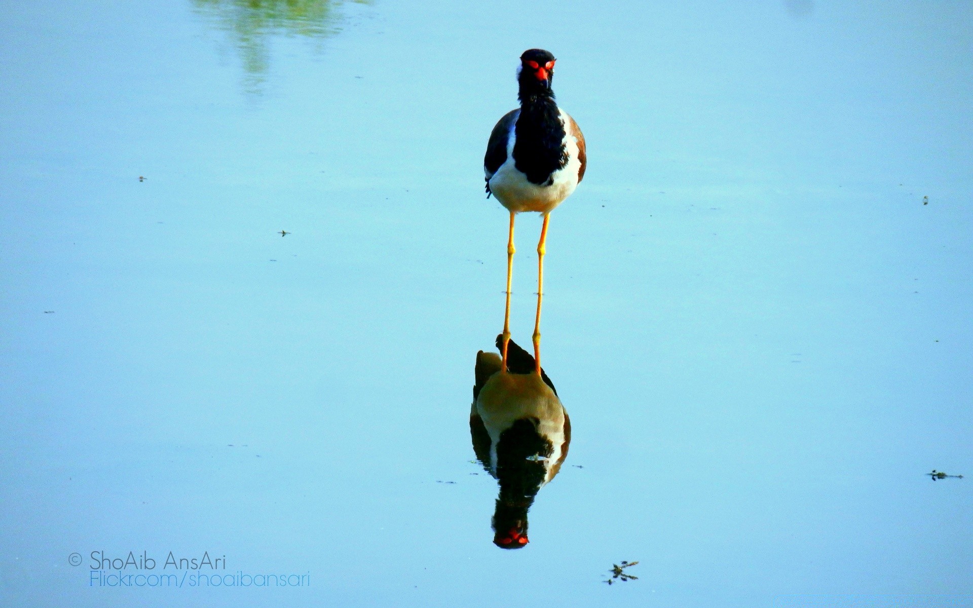 A waterfowl is reflected in the water