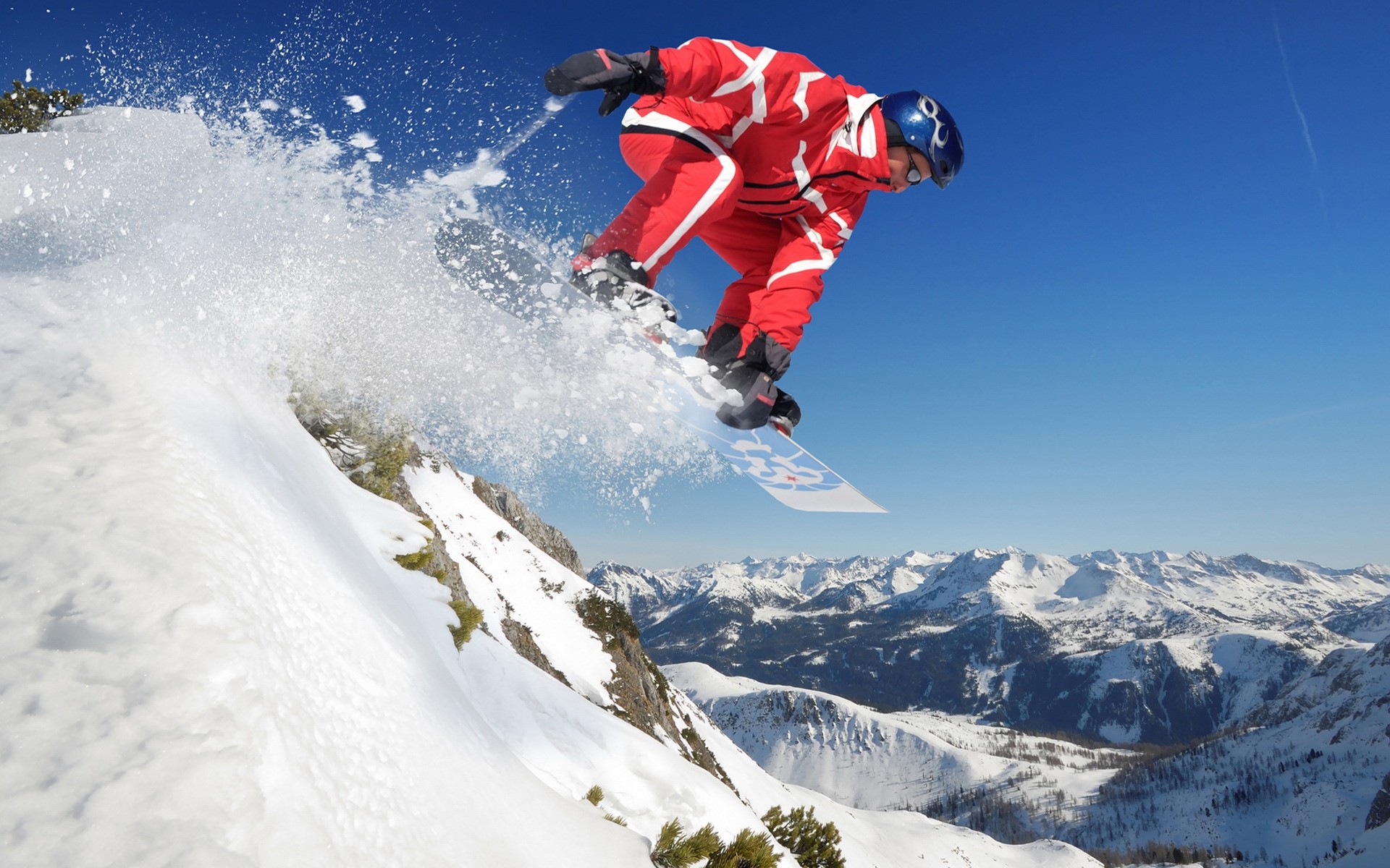 The snowboarder soared up leaving snow splashes behind him
