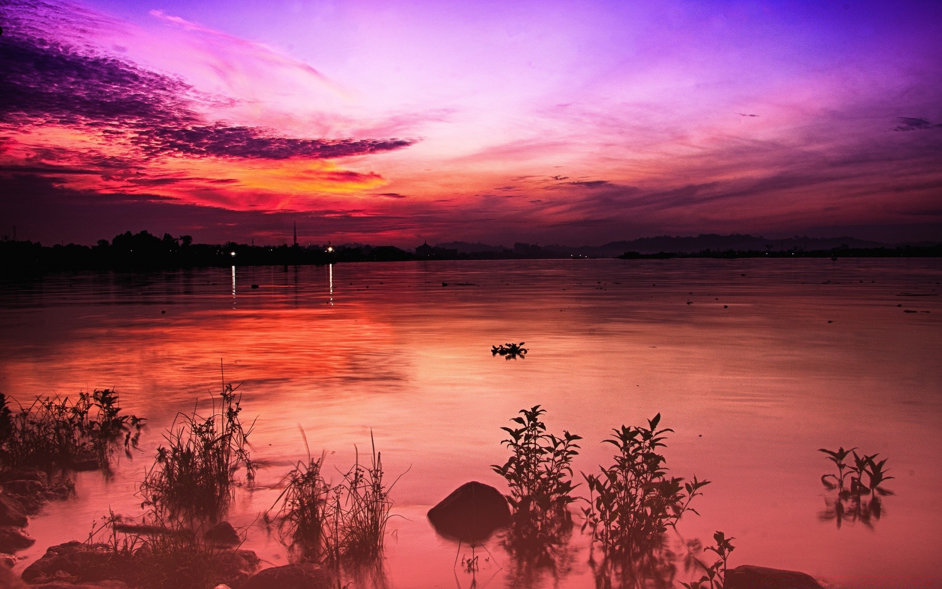 Sunset on a wide river. There are multicolored cirrus clouds in the sky