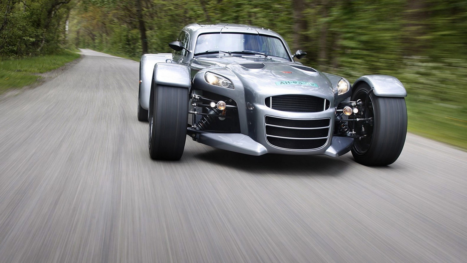 A sports car cuts through a forest road