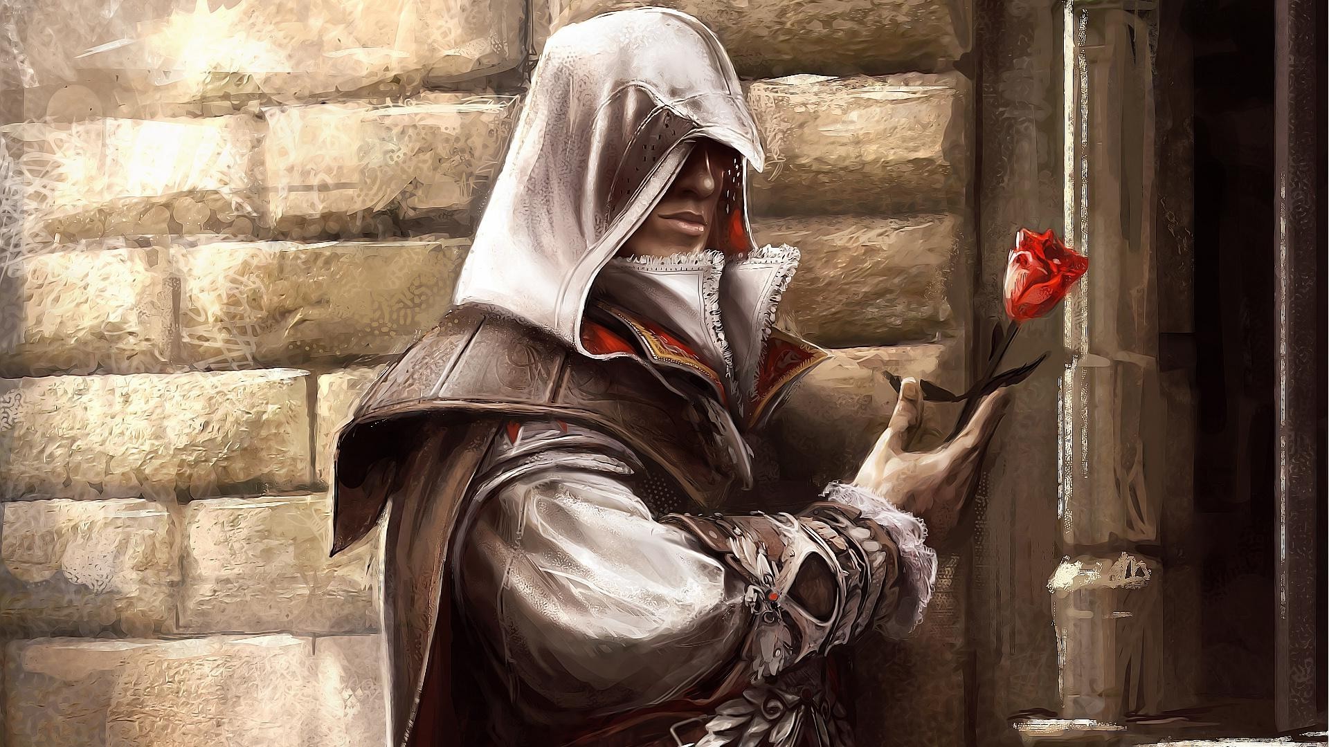 The main character from the game assassin's creed in a hood in profile