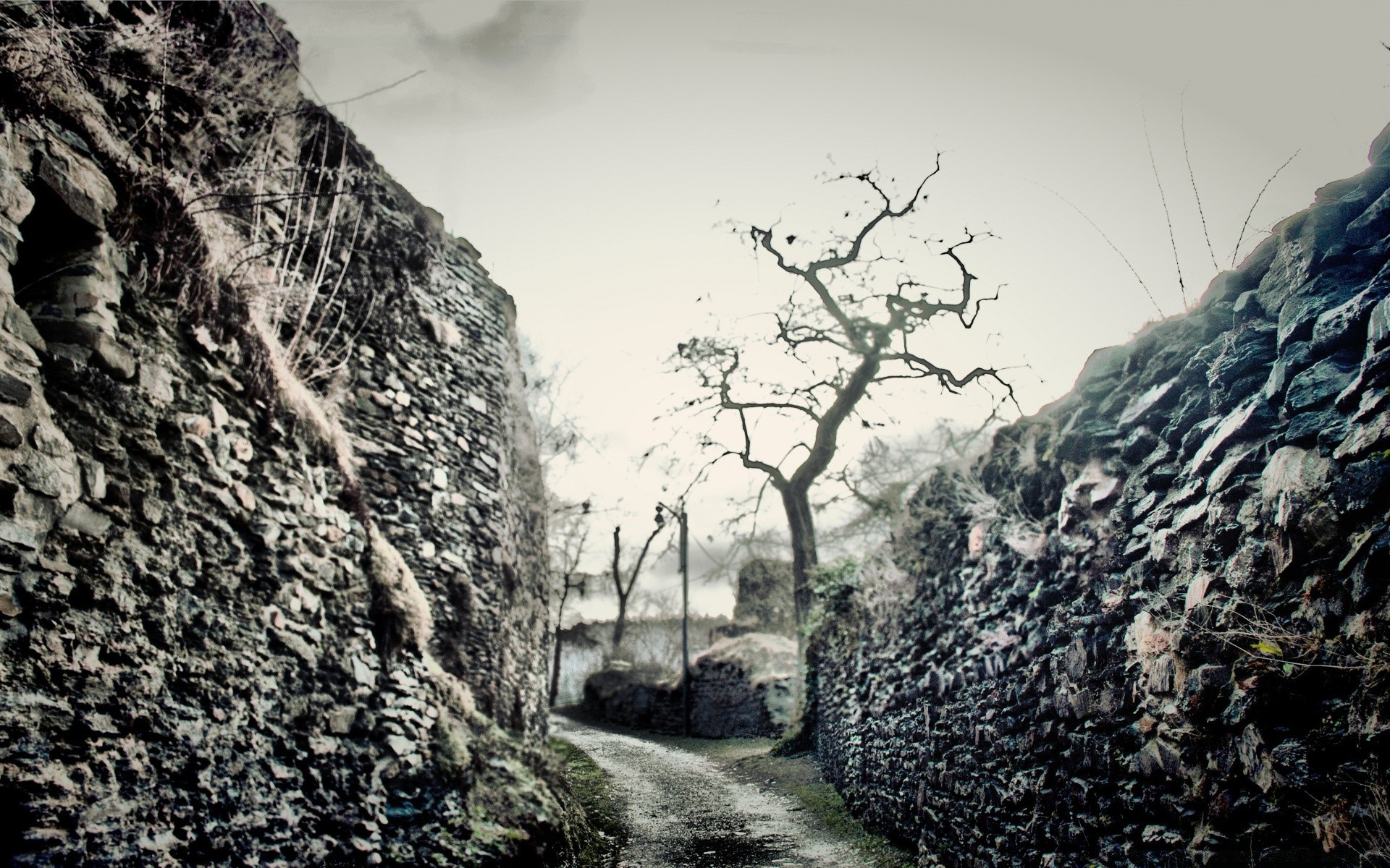 Nature, wood on rocks and boulders