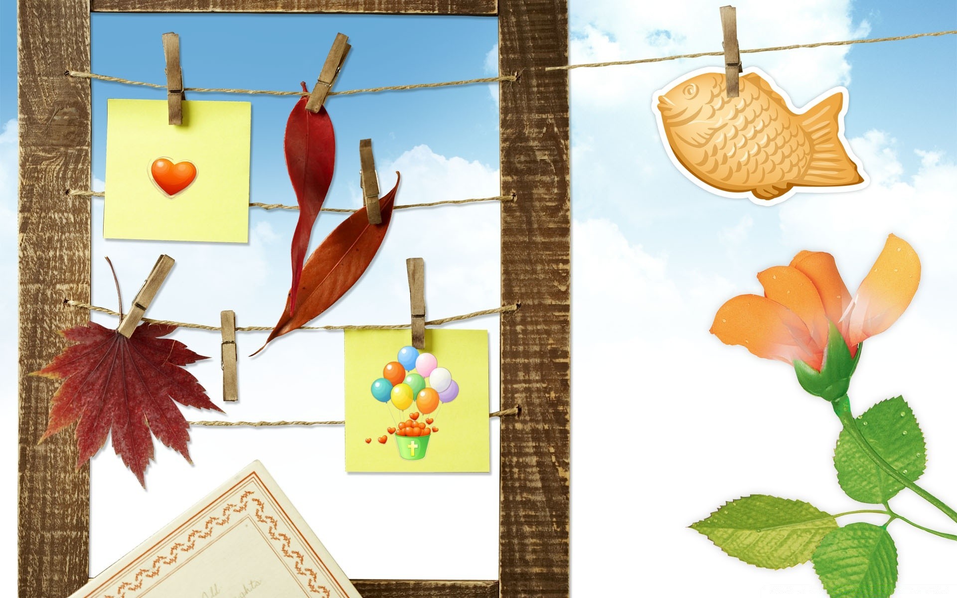Autumn leaves and drawings attached to ropes with clothespins