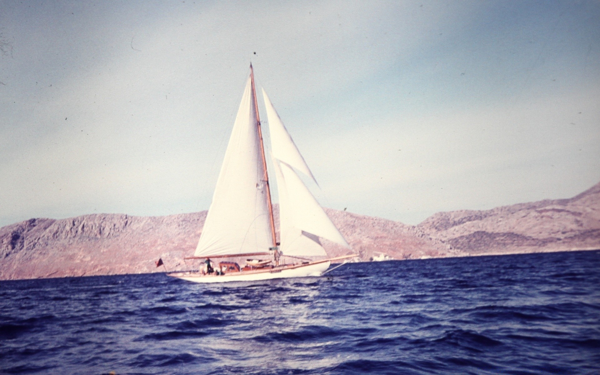 Sailboat in the sea on the background of hills