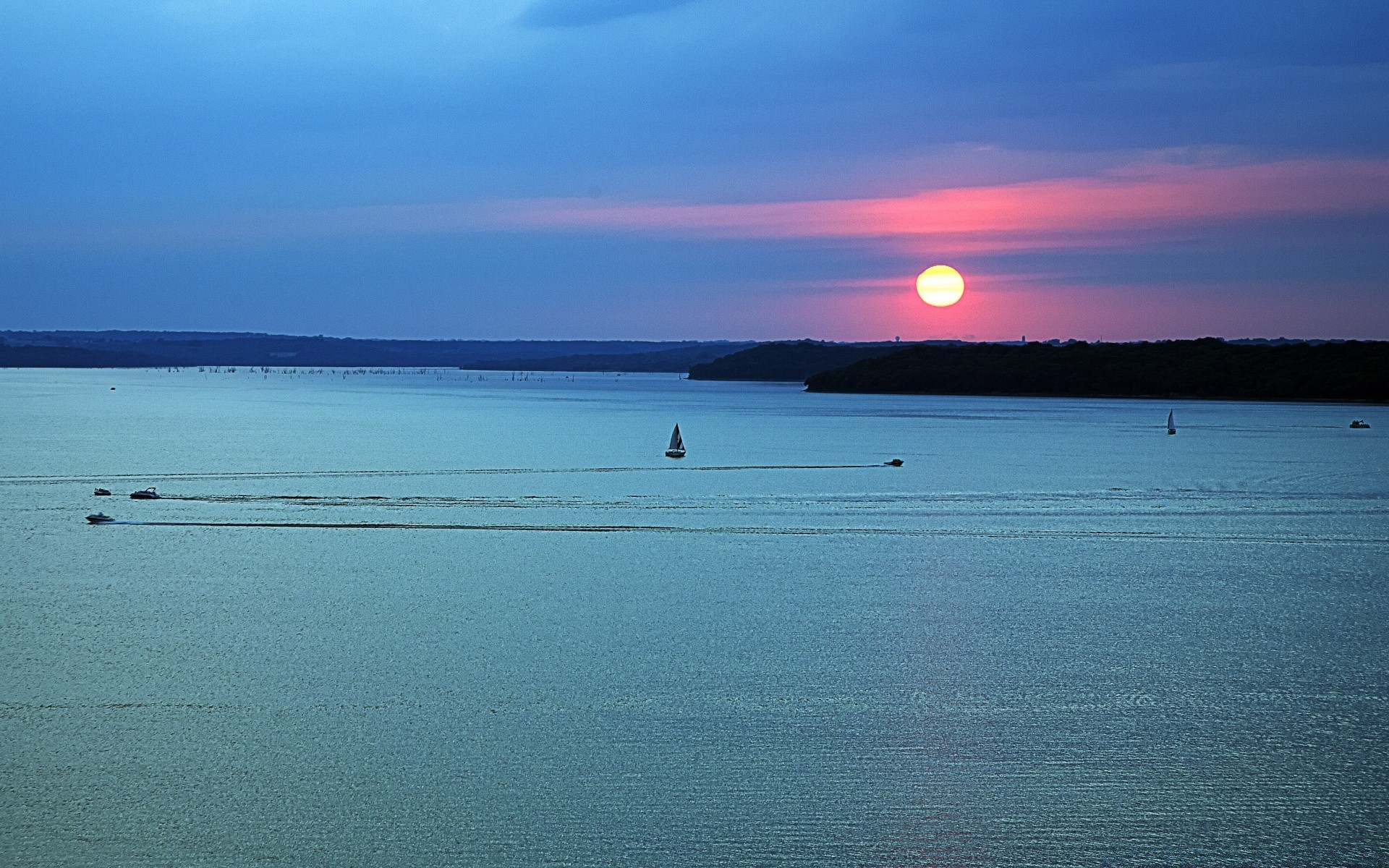 Sunset on the water, boats are sailing