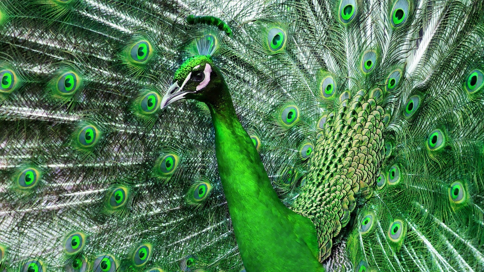Photo of a green peacock with a tail for the whole frame