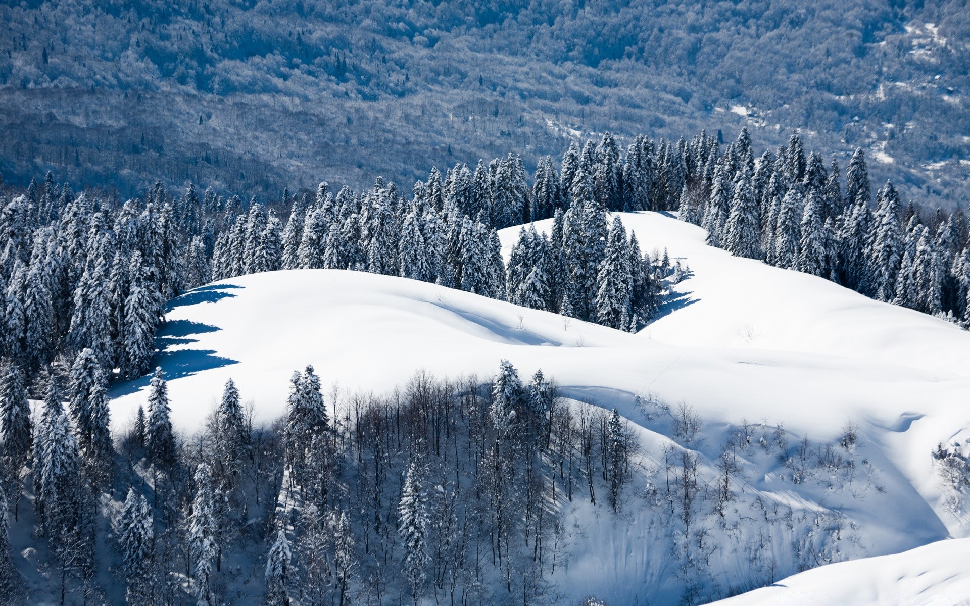 Beautiful view of the snowy edge among the fir trees in the mountains