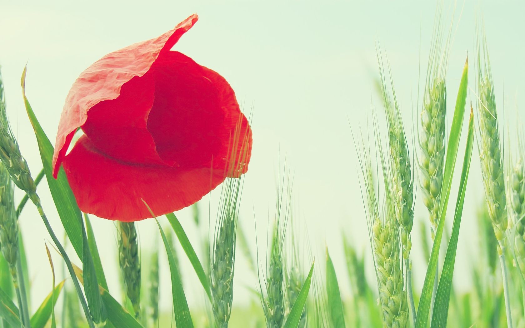A scarlet poppy among a field of spikelets