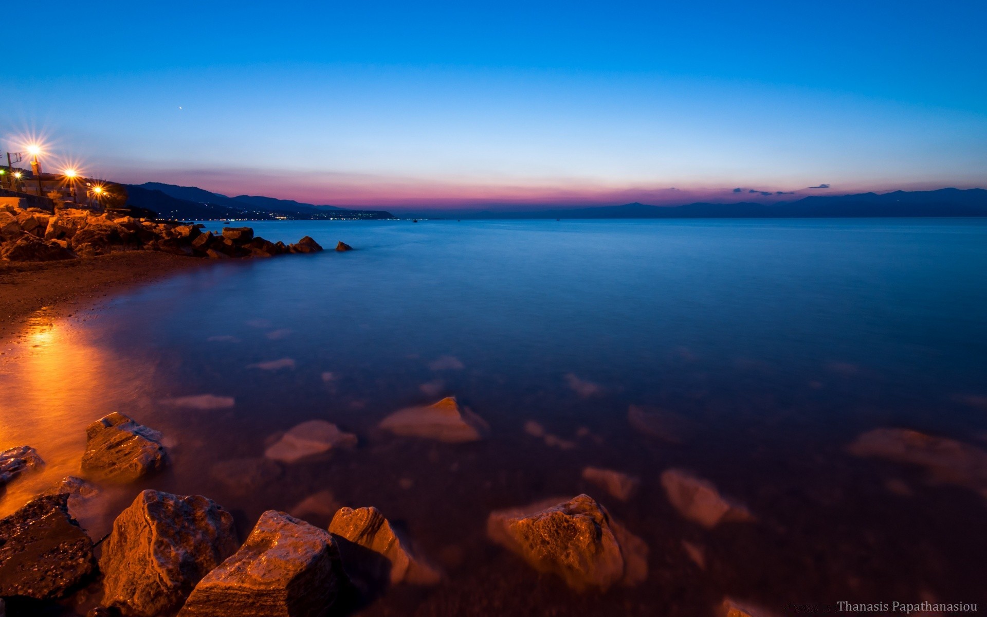 Sea bay at sunset, twilight, rocky shore, lights of the night resort town