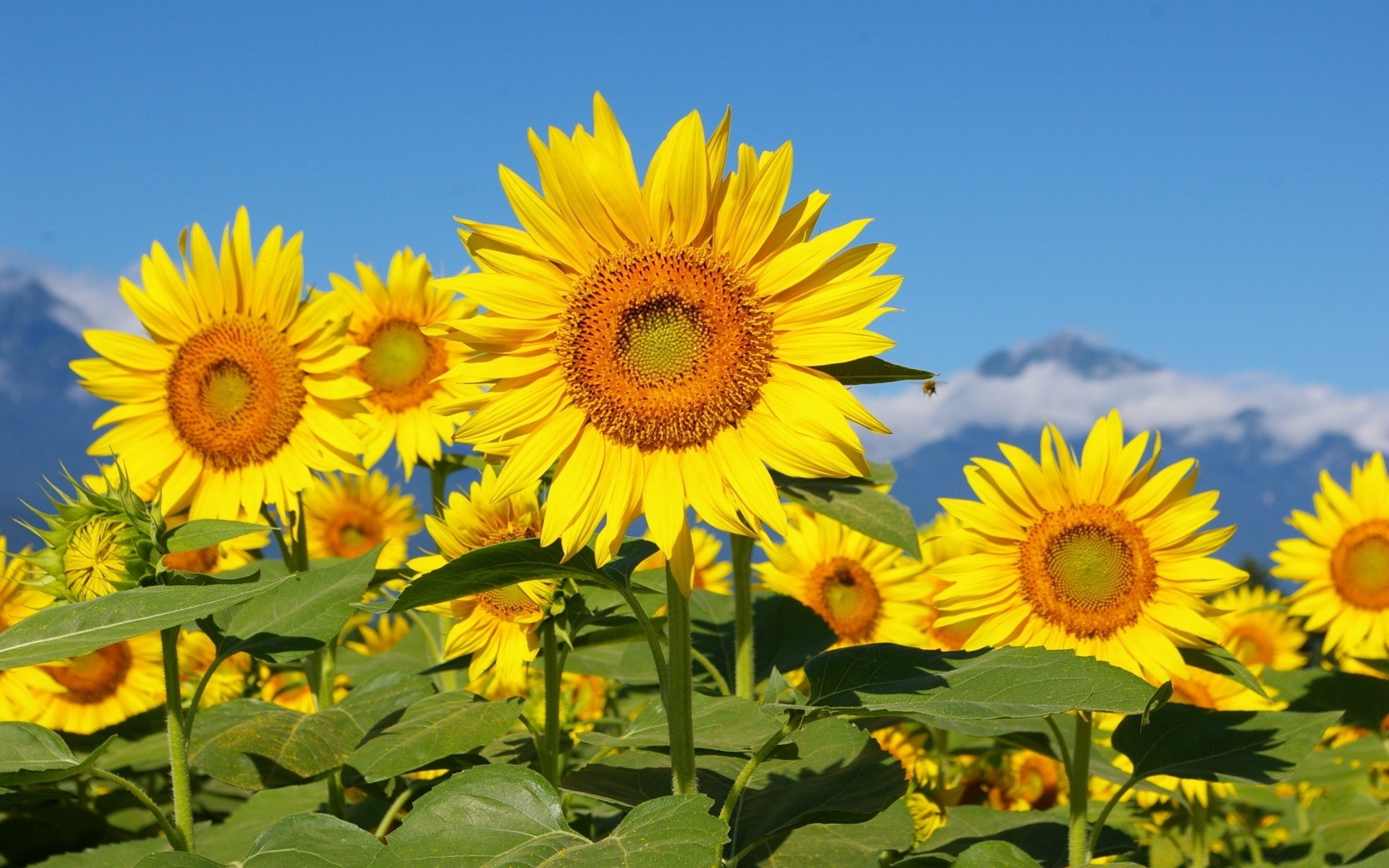 Blooming sunflowers on a background of blue sky and mountains