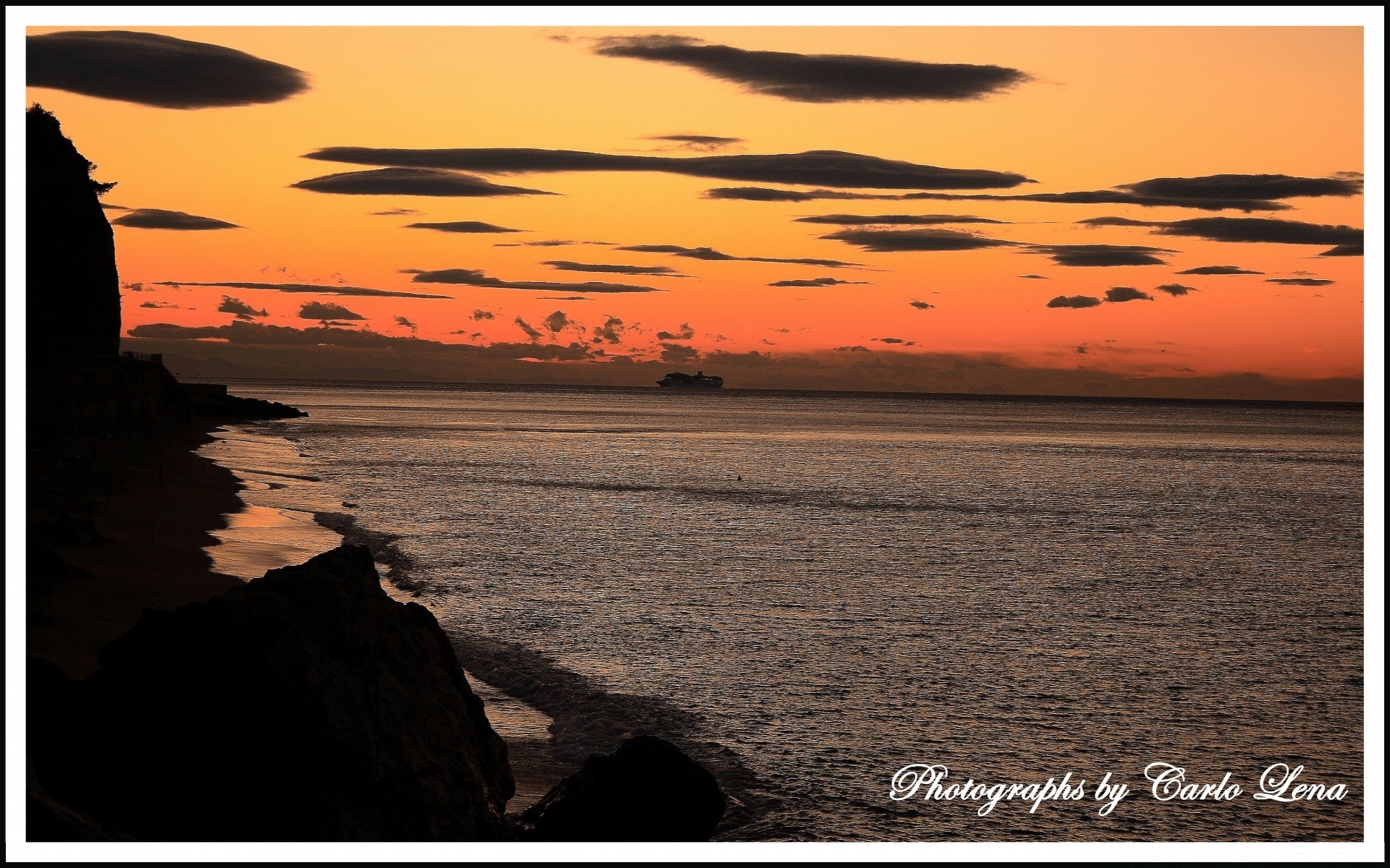 Red sunset, rocky coast, gray sea with a motor ship in the distance