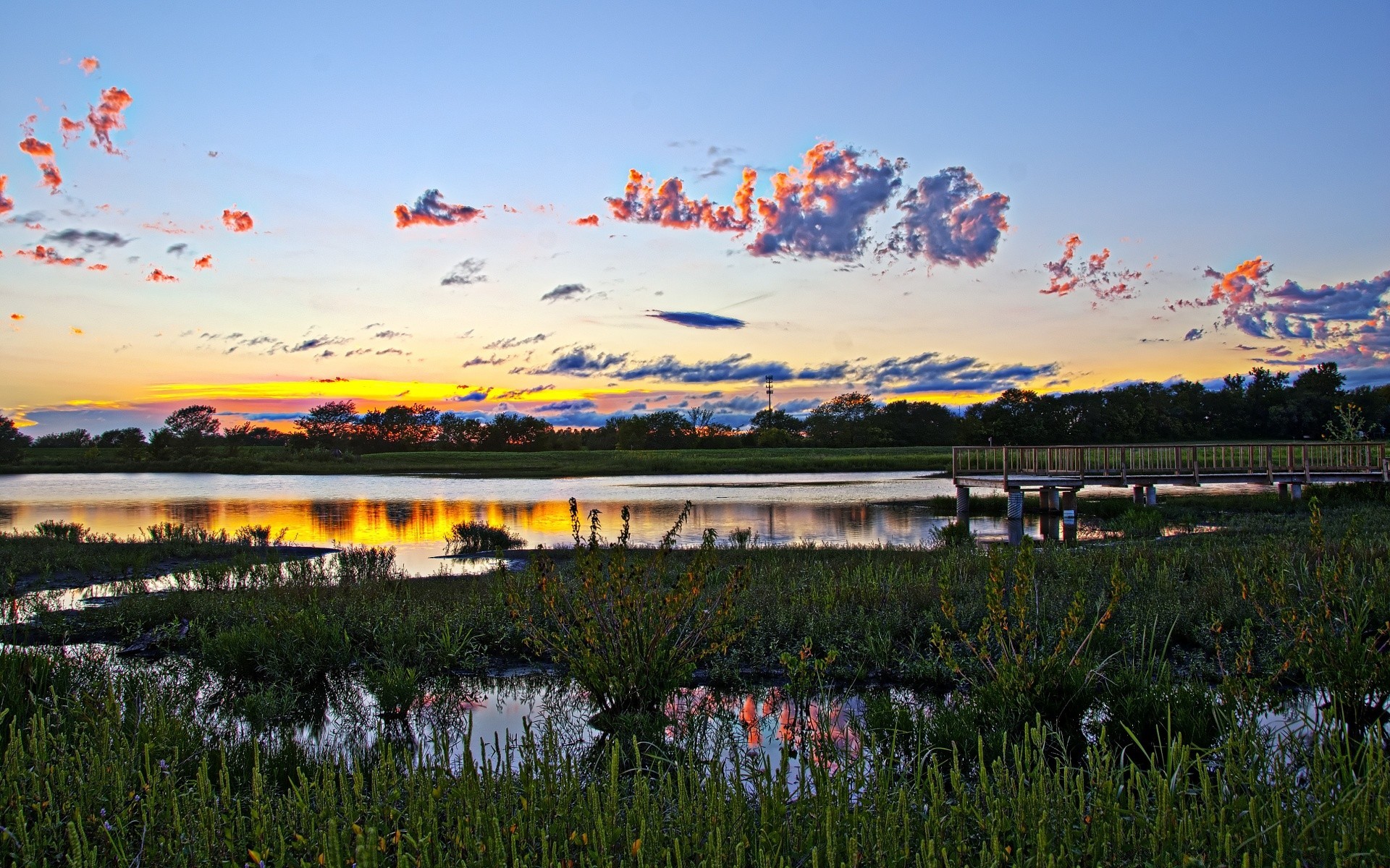 A dry tree against the background of a beautiful sunset on a pond whose shore is paros with treesA dry tree against the background of a beautiful sunset on a pond whose shore is paros with trees