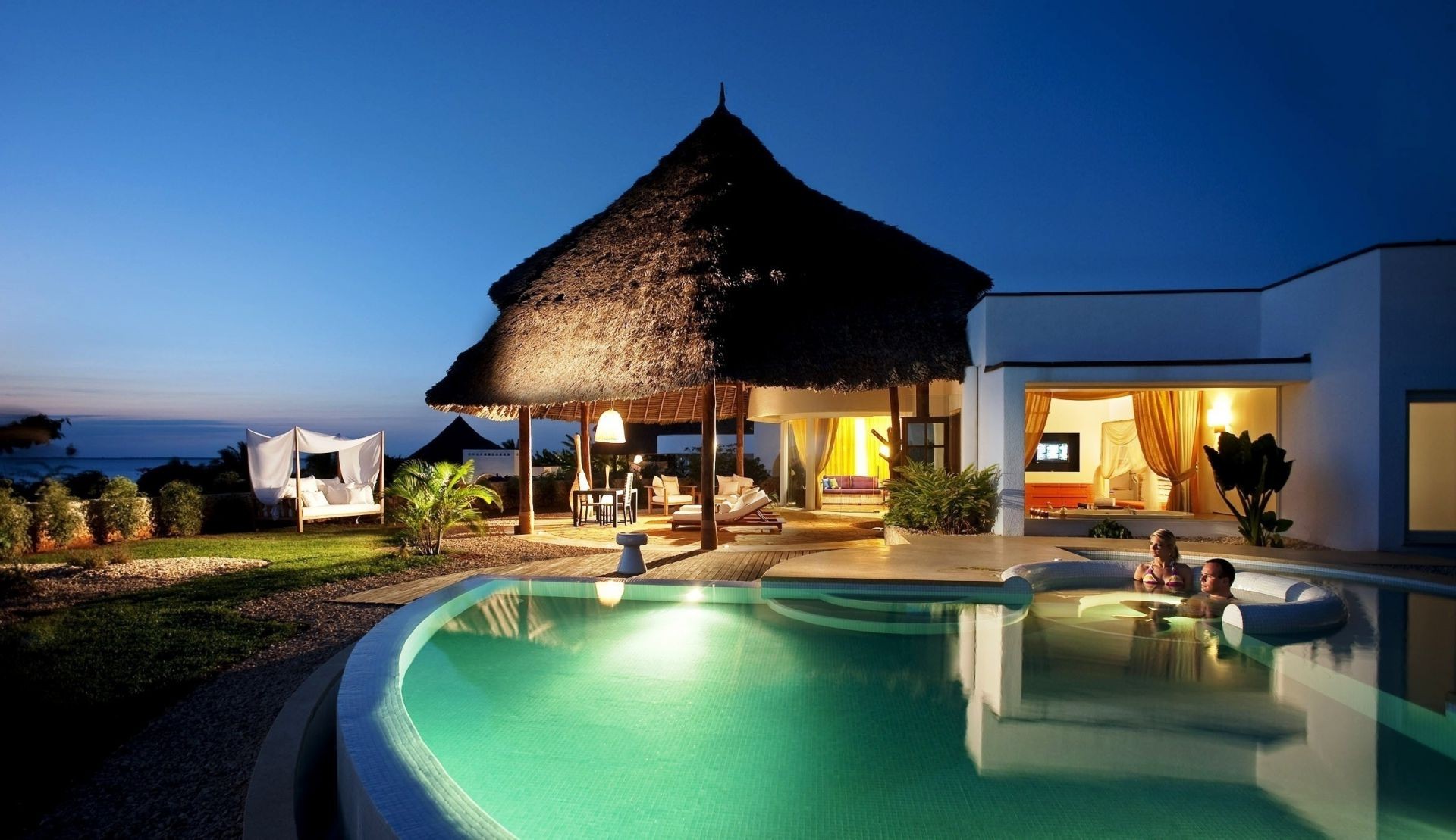 The territory of the hotel with blue water in the pool